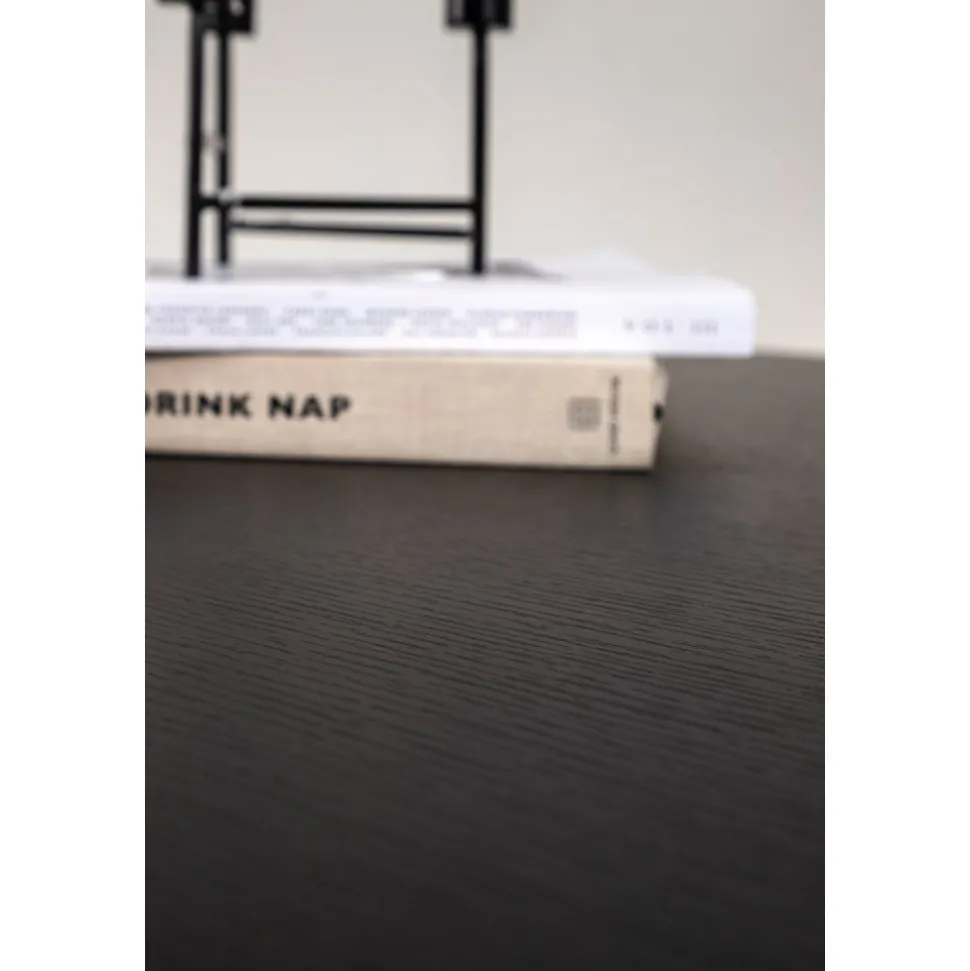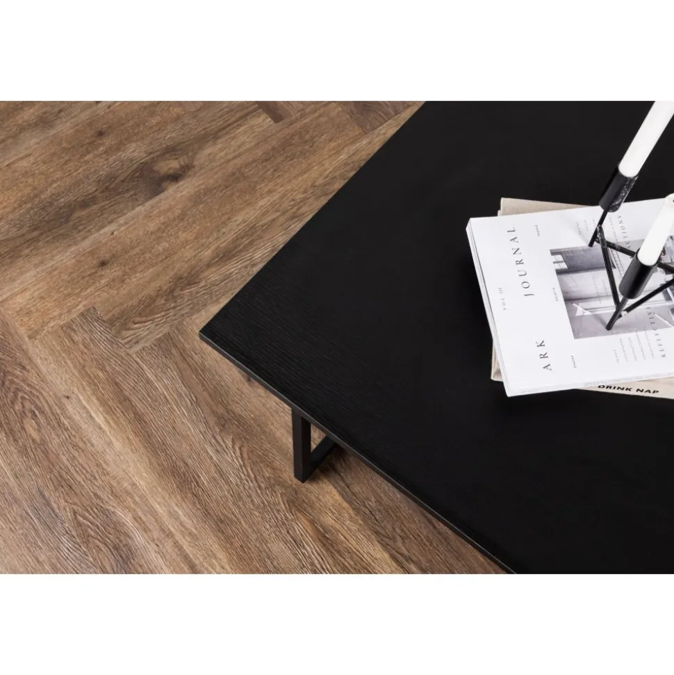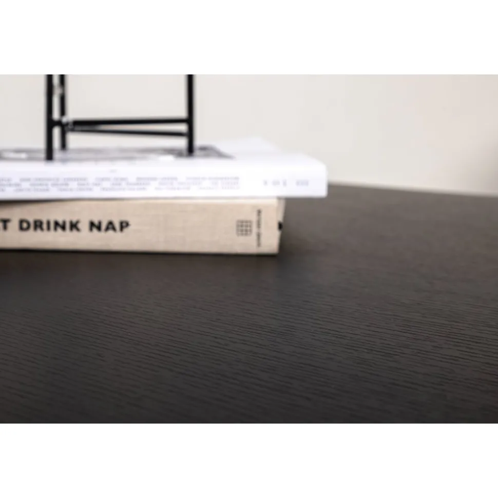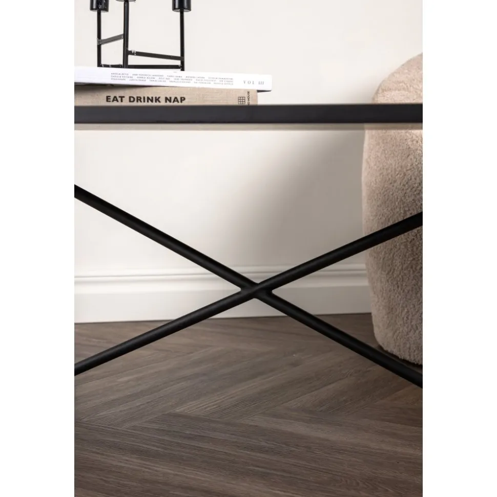 Bord med raka skandinaviska former och dekorativa detaljer som skapar ett iögonfallande blickfång. Bordsskivan är i svart MDF och underredet i svart stål med ett smakfullt kryss som sammanlänkar de raka bordsbenen. Den generösa storleken gör att bordet passar utmärkt framför den större soffan och den svarta kulören är enkel att matcha med övrig inredning.