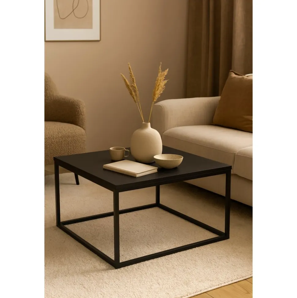 Detta moderna soffbord kombinerar en stilren design med praktisk funktion. Bordsskivan är tillverkad i svart melaminbelagd MDF som ger en tålig yta, medan det minimalistiska underredet i metall skapar en luftig och modern känsla. Perfekt som mittpunkt i vardagsrummet och lätt att matcha med olika inredningsstilar.