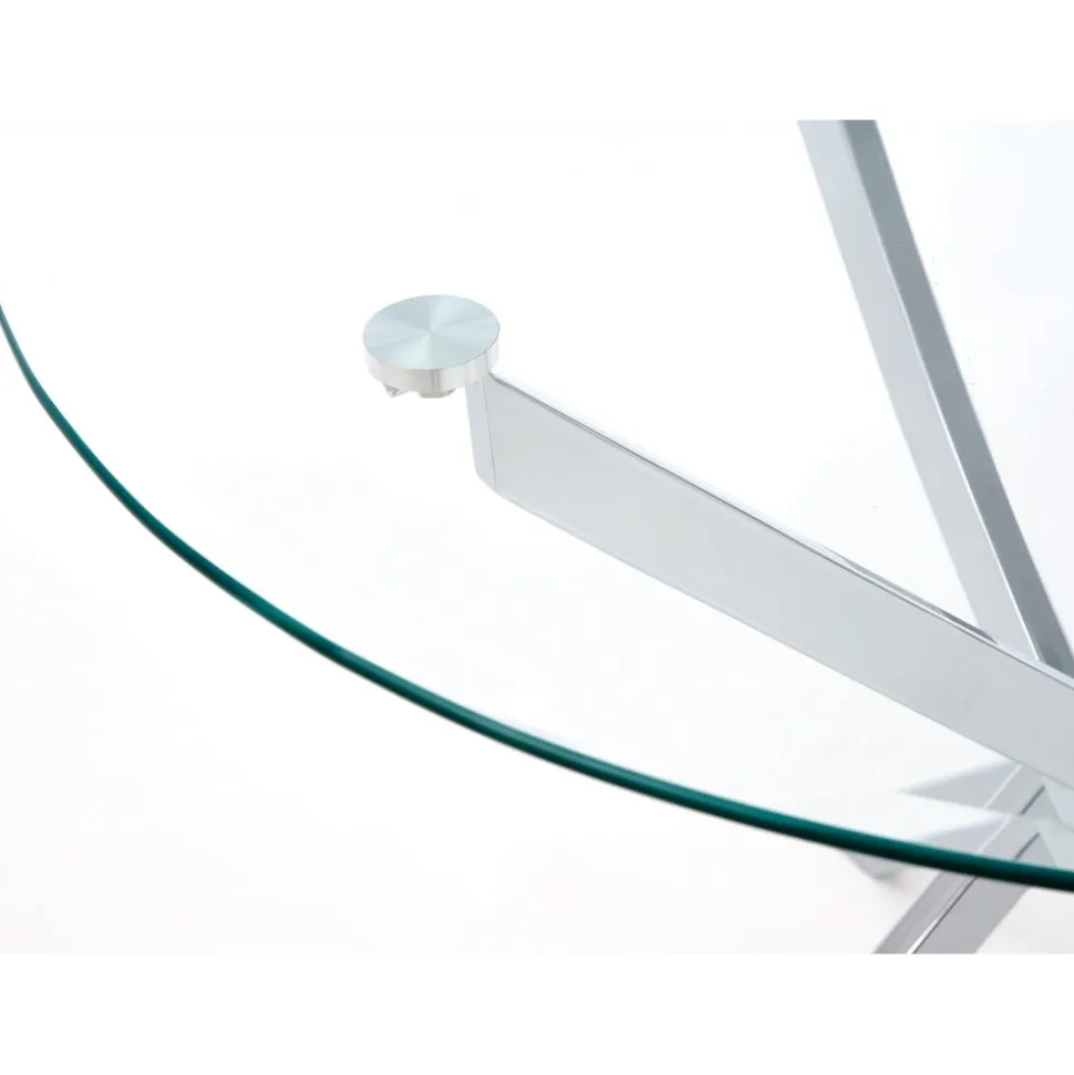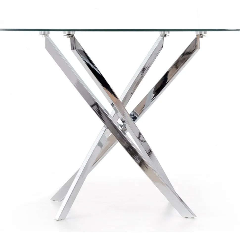Matbord med bordsskiva av glas och underrede av krompläterad stål.