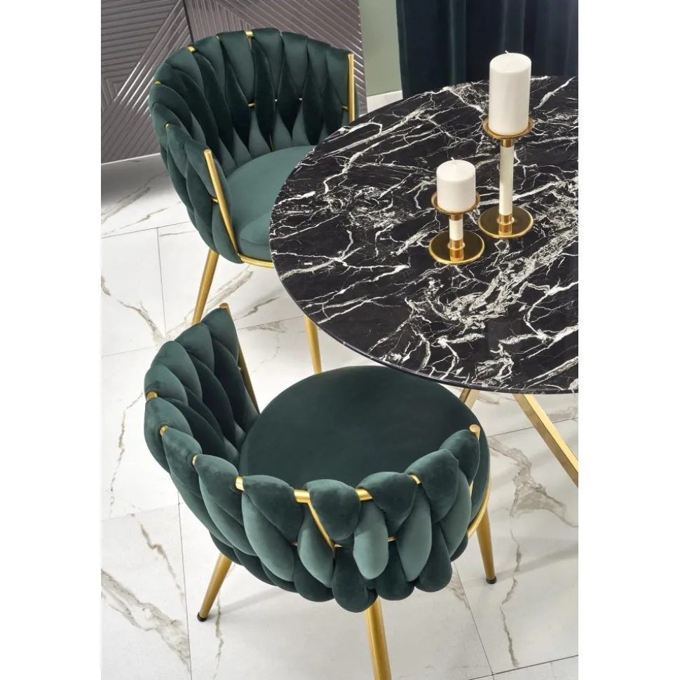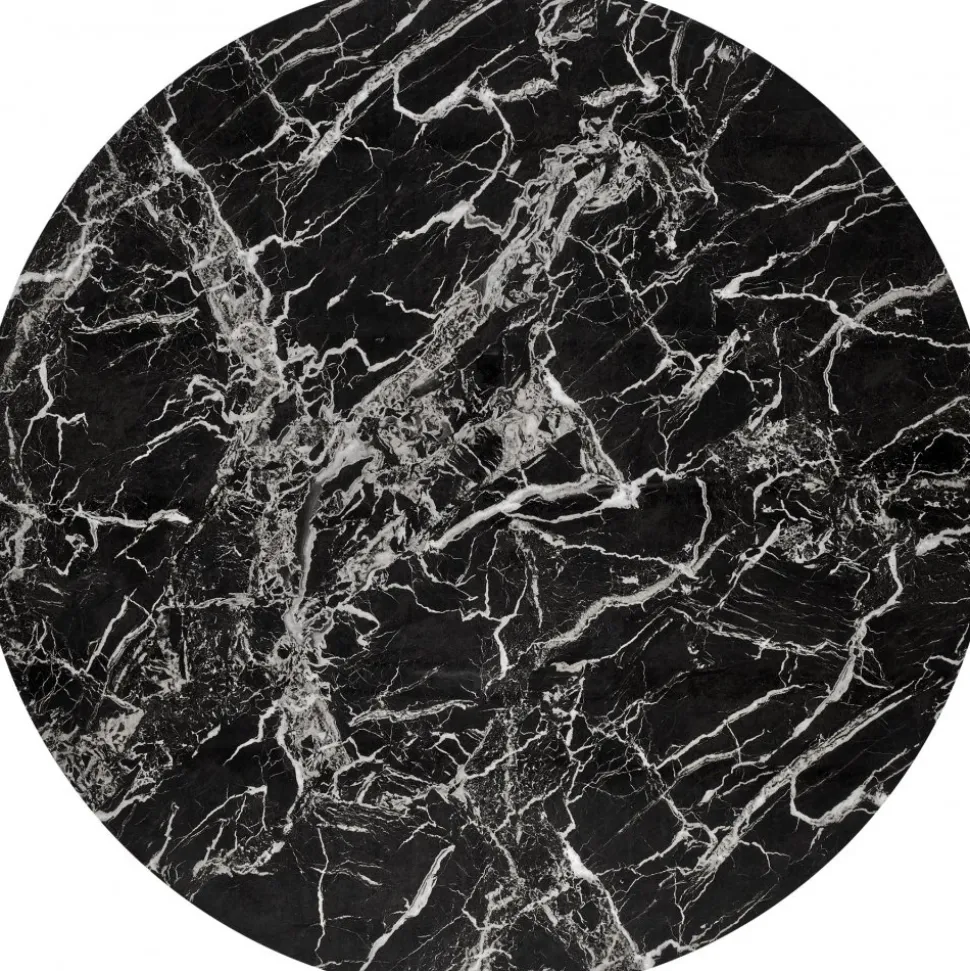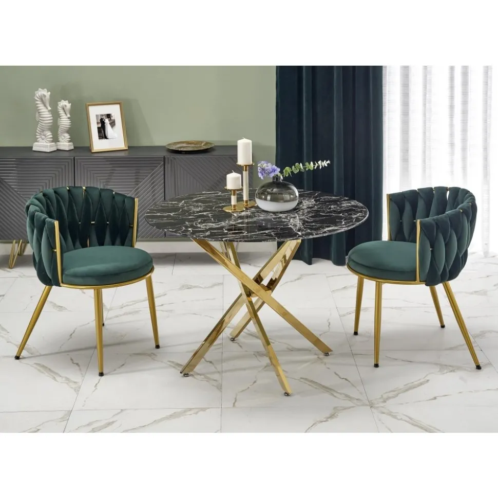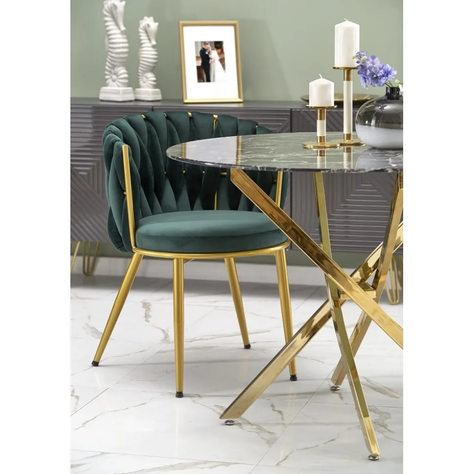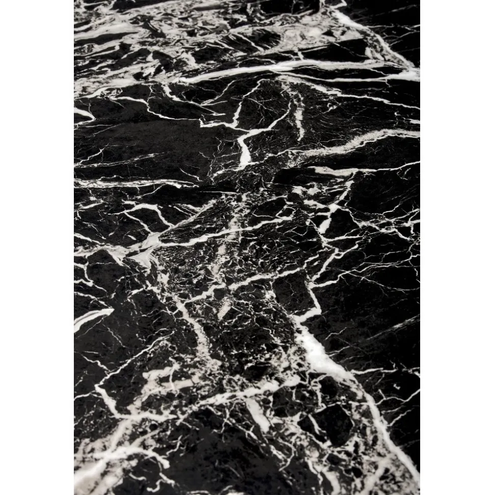 Matbord med bordsskiva av glas med marmoreffekt och underrede av kromat stål.
