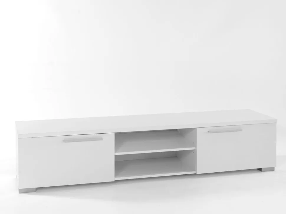 En fin TV-bänk med en modern design. Bänken är tillverkad av MDF med vit melamin, två skåp med aluminium handtag och kromade metallben. I mittenpartiet finns det två öppna hyllplan för smart förvaring av exempelvis elektronik.