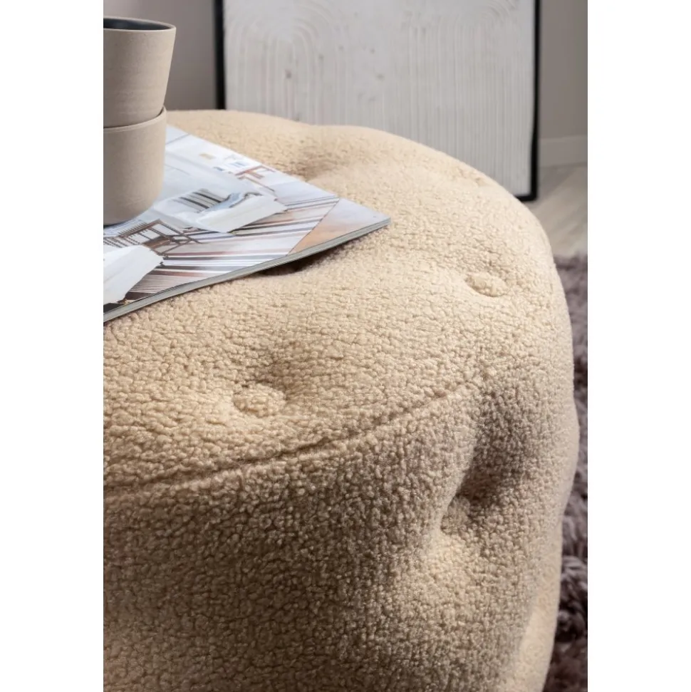Sittpuff av trä, klädd med polyestertyg.