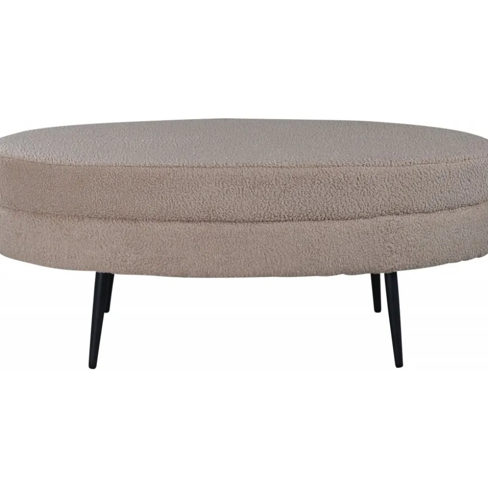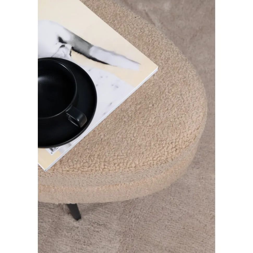 Sittpuff av trä och stål, klädd med polyestertyg.