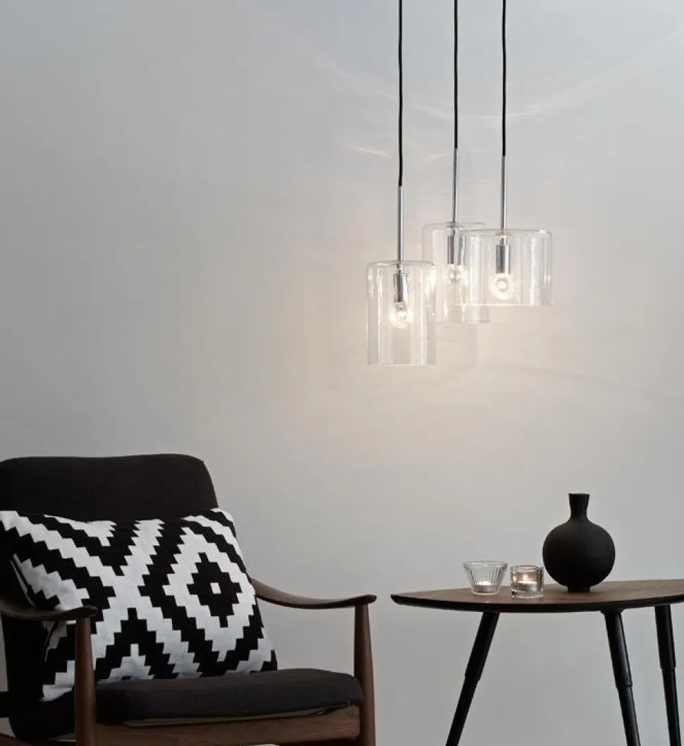 Rockford härliga med en stilren design. Tillverkad i kromad metall med tre skärmar i glas. 1,5 meter sladd med krokupphäng. Små lamphållare (E14). Max 40W glödlampor eller motsvarande styrka i halogen, lågenergi eller LED. Lampan monteras lätt på plats och passar perfekt in på flera olika platser i hushållet.