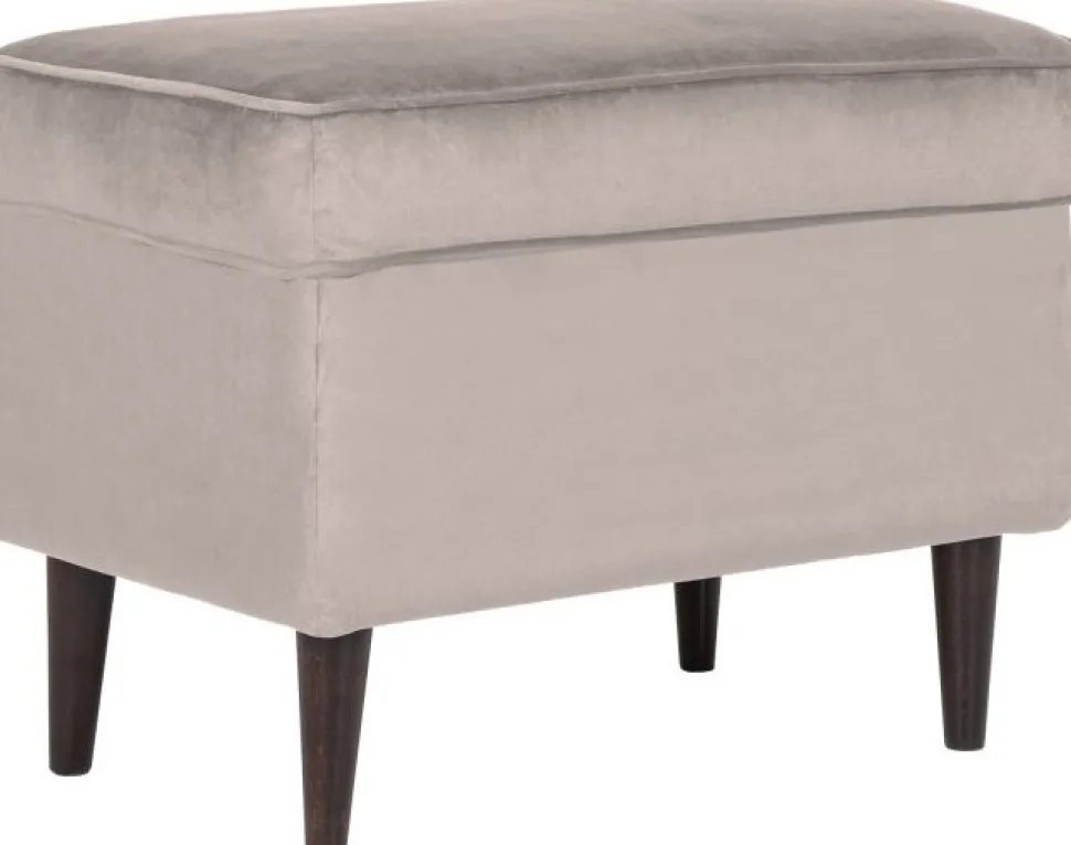 Fotpall av trä. Klädd med polyestertyg.