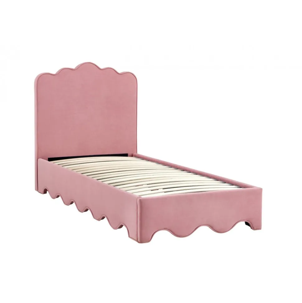 Sängram i rosa sammetstyg. Madrass ingår ej. Sängram med runda och mjuka former för att ge ett lugnt intryck i sovrummet.