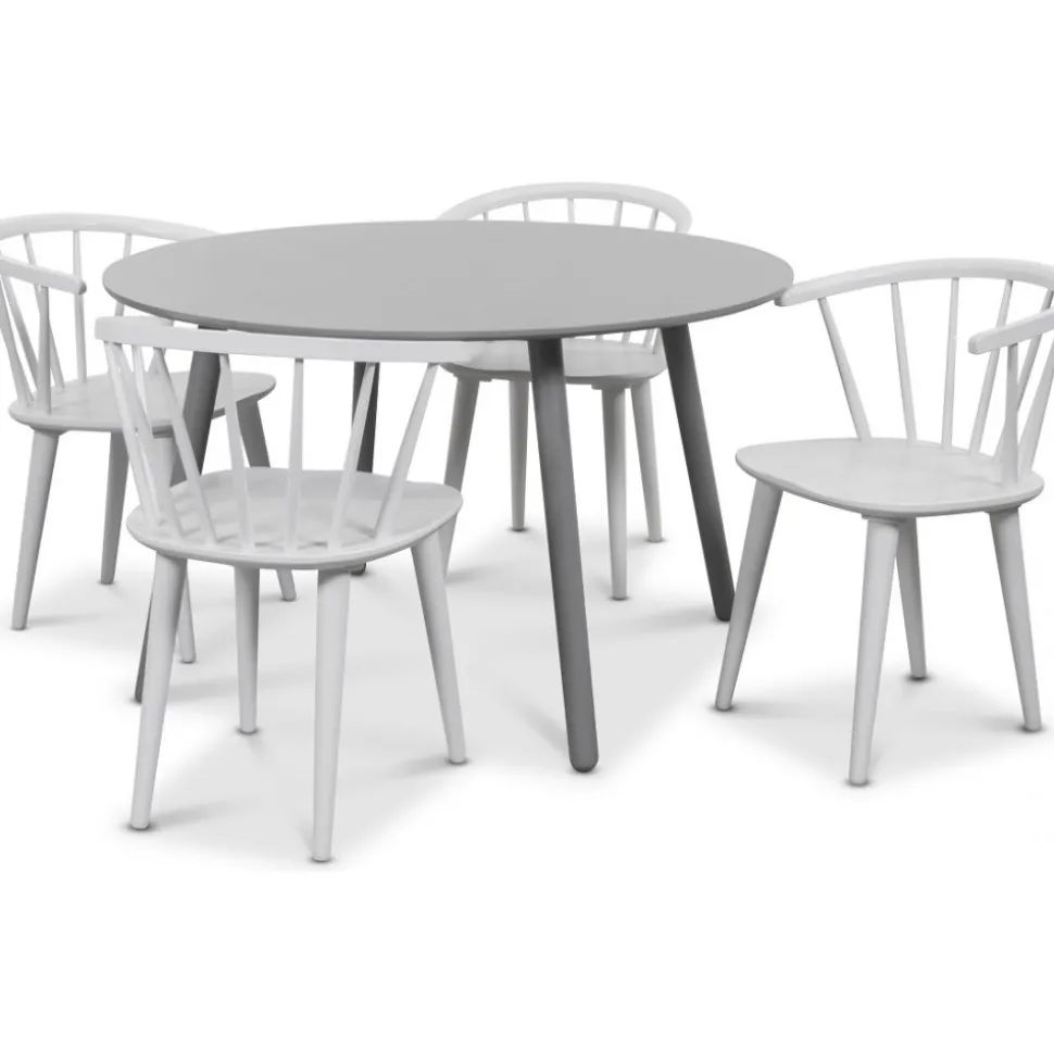 Matgrupp från Skånska Möbelhuset, Klassiskt runt matbord Rosvik 120 cm diameter i grålackat trä. Fyra stycken vita Fredrik Pinnstolar!