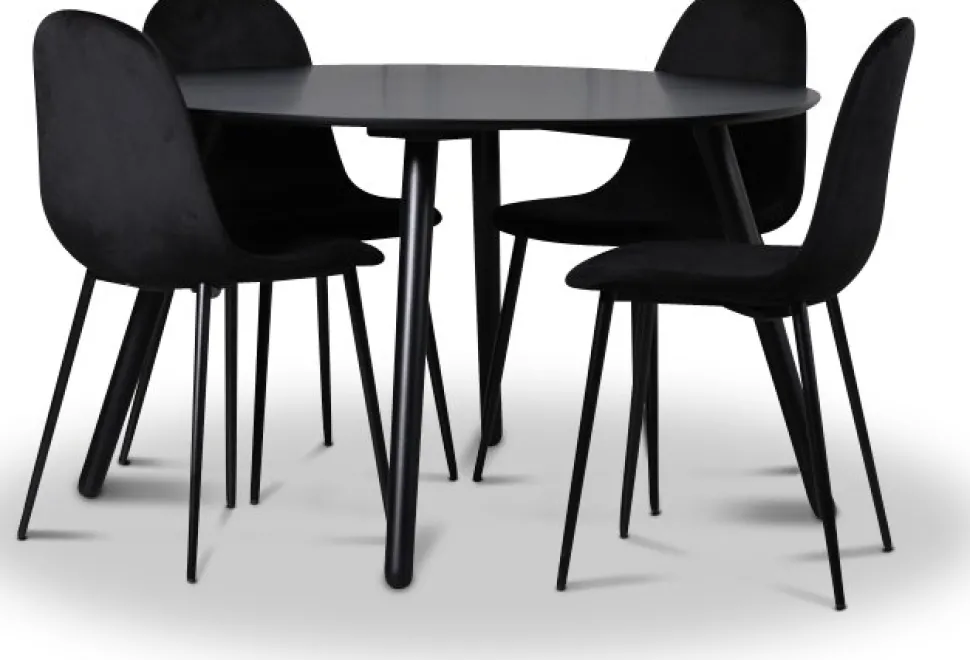 Matgrupp från Skånska Möbelhuset, Rosvik matbord 120 cm i diameter. Medföljer 4 st matchande Carisma sammetstolar i svart sammet med svarta ben.