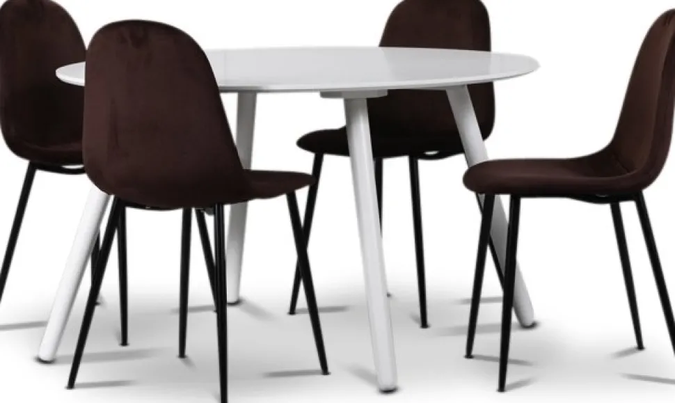 Matgrupp från Skånska Möbelhuset, Rosvik matbord 120 cm i diameter. Medföljer 4 st matchande Carisma sammetstolar i bordeauxfärgat sammet med svarta ben.