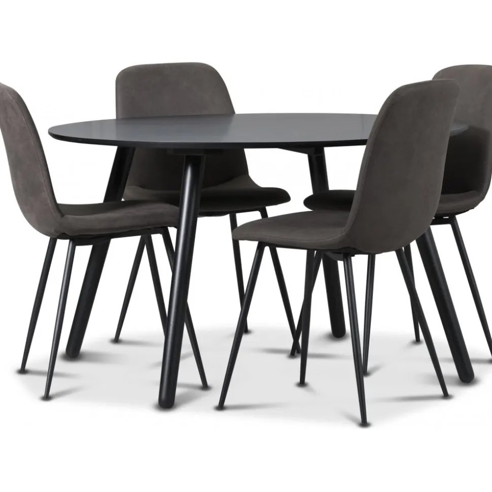 Matgrupp från Skånska Möbelhuset, Rosvik matbord 120 cm i diameter. Medföljer 4 st matchande Smokey matstolar i gråbrunt vintage tyg med svarta ben.