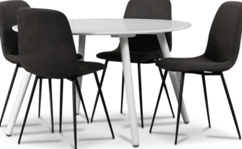 Matgrupp från Skånska Möbelhuset, Rosvik matbord 120 cm i diameter. Medföljer 4 st matchande Smokey matstolar i gråbrunt vintage tyg med svarta ben.