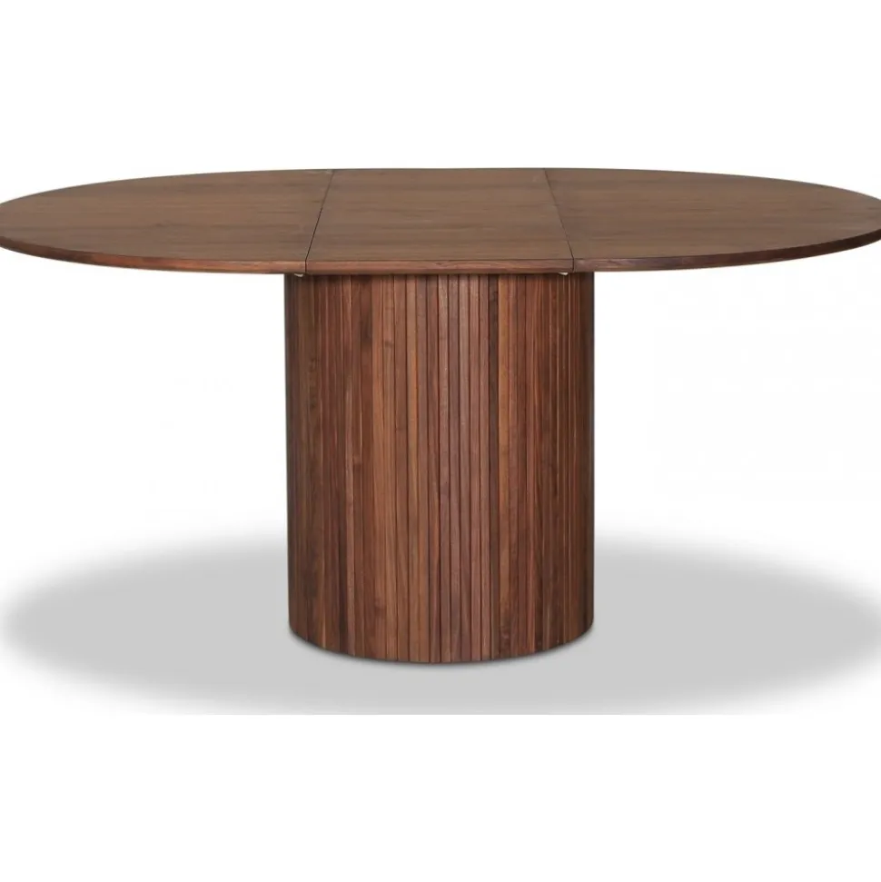 Detta runda matbord i elegant valnöt har en diameter på 115 cm och levereras med en smart, vikbar iläggsskiva som enkelt förlänger bordet till 160 cm. När iläggsskivan inte används förvaras den praktiskt i bordets mittdel. Tillverkat i en kombination av massivt trä och fanér för både hållbarhet och ett sofistikerat utseende.