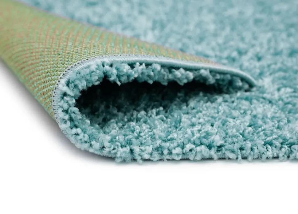 Shaggy Lux är en maskinvävd med jutevävbaksida. Mattan har en blå lugg som består utav tvinnade trådar i olika tjocklek.
