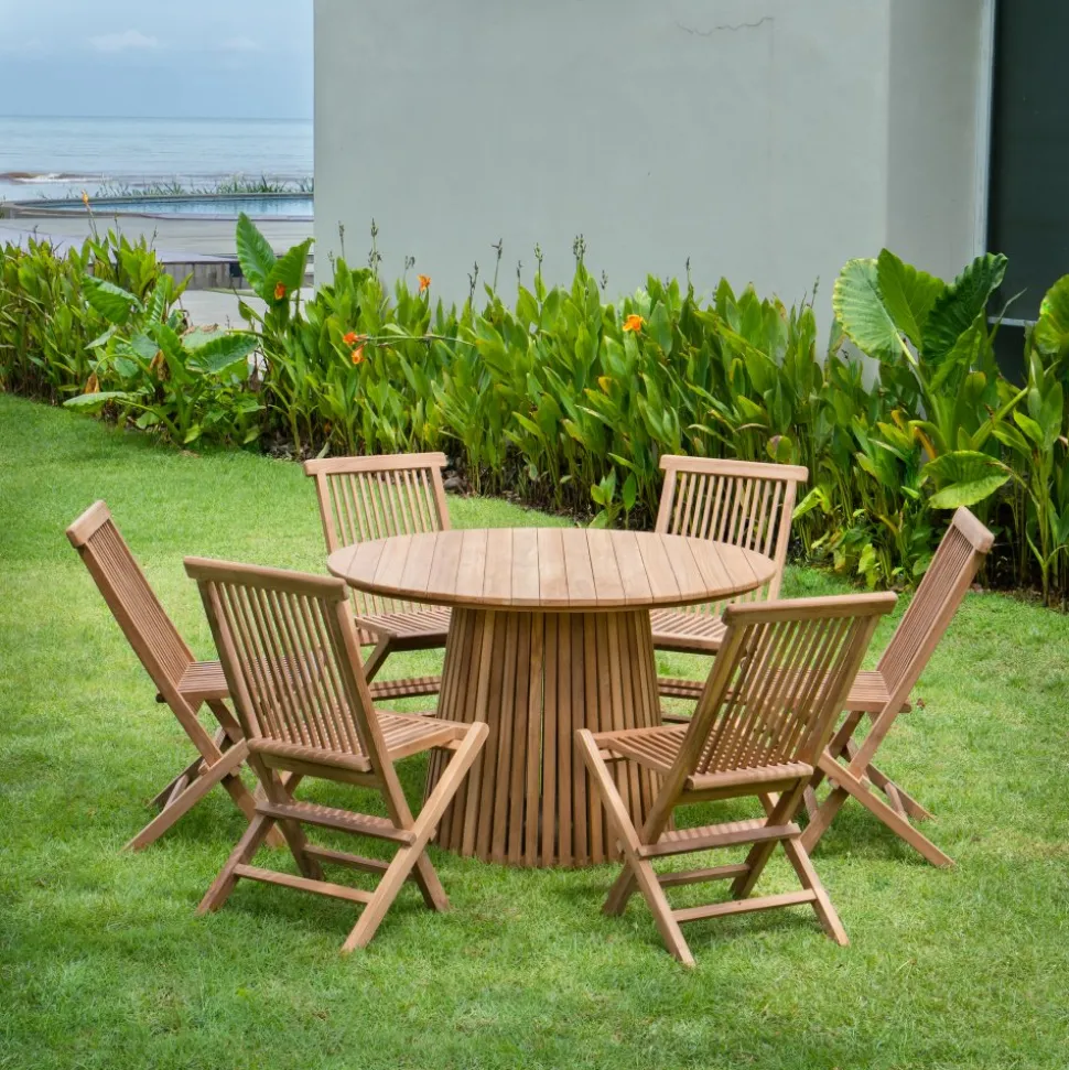 Saltö matgrupp för uteplatsen med ett runt matbord i massiv teak, tillsammans med sex stycken stolar i massiv teak. En klassisk kombination.