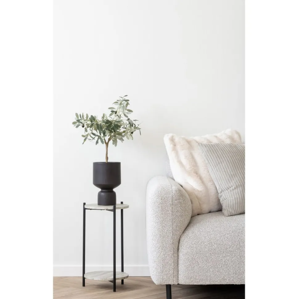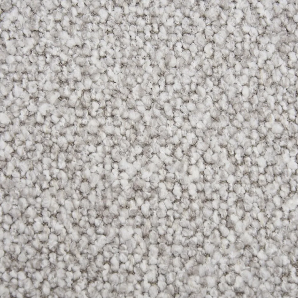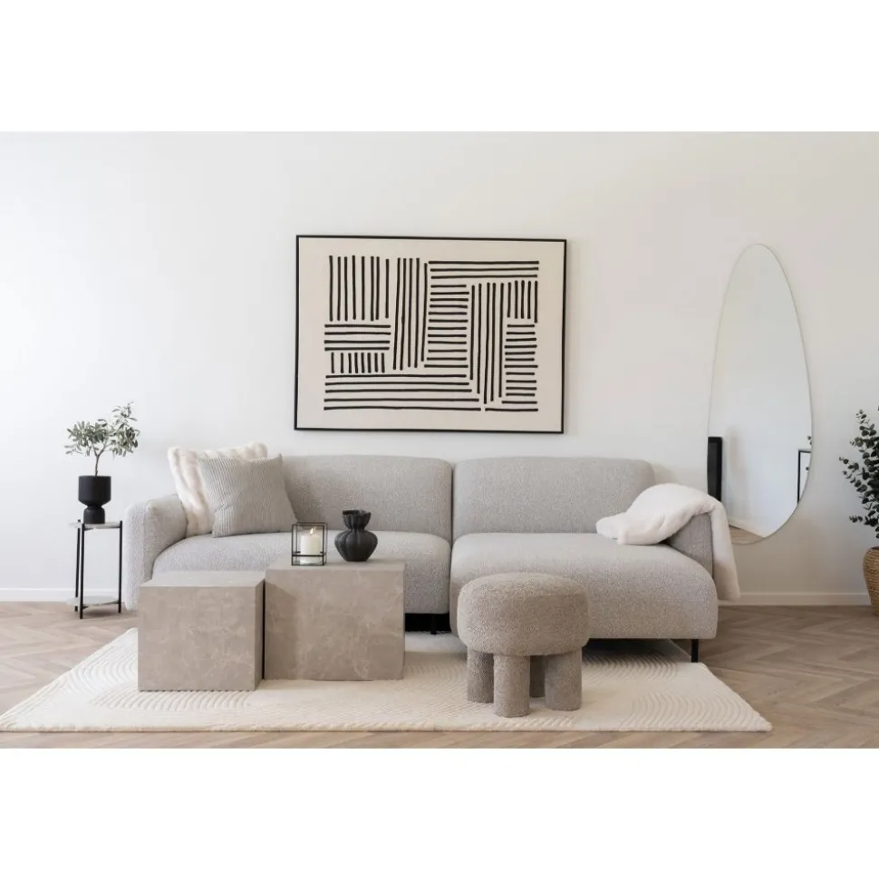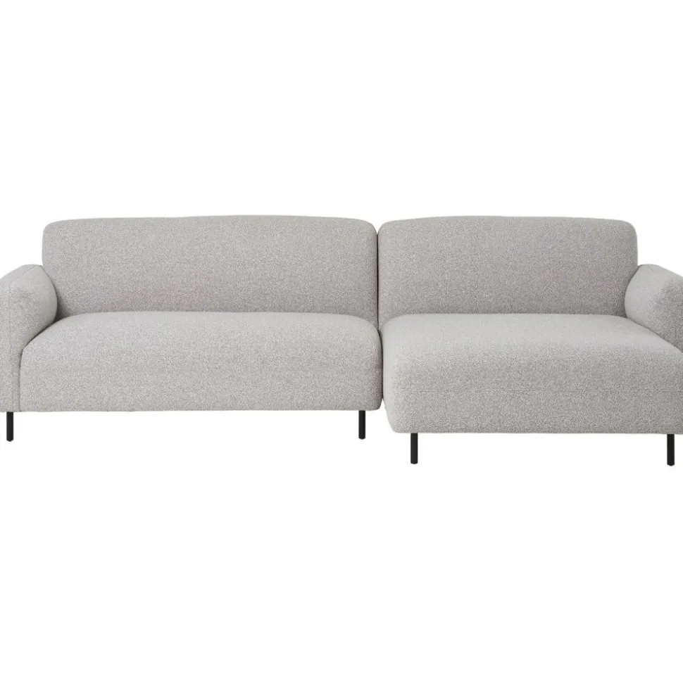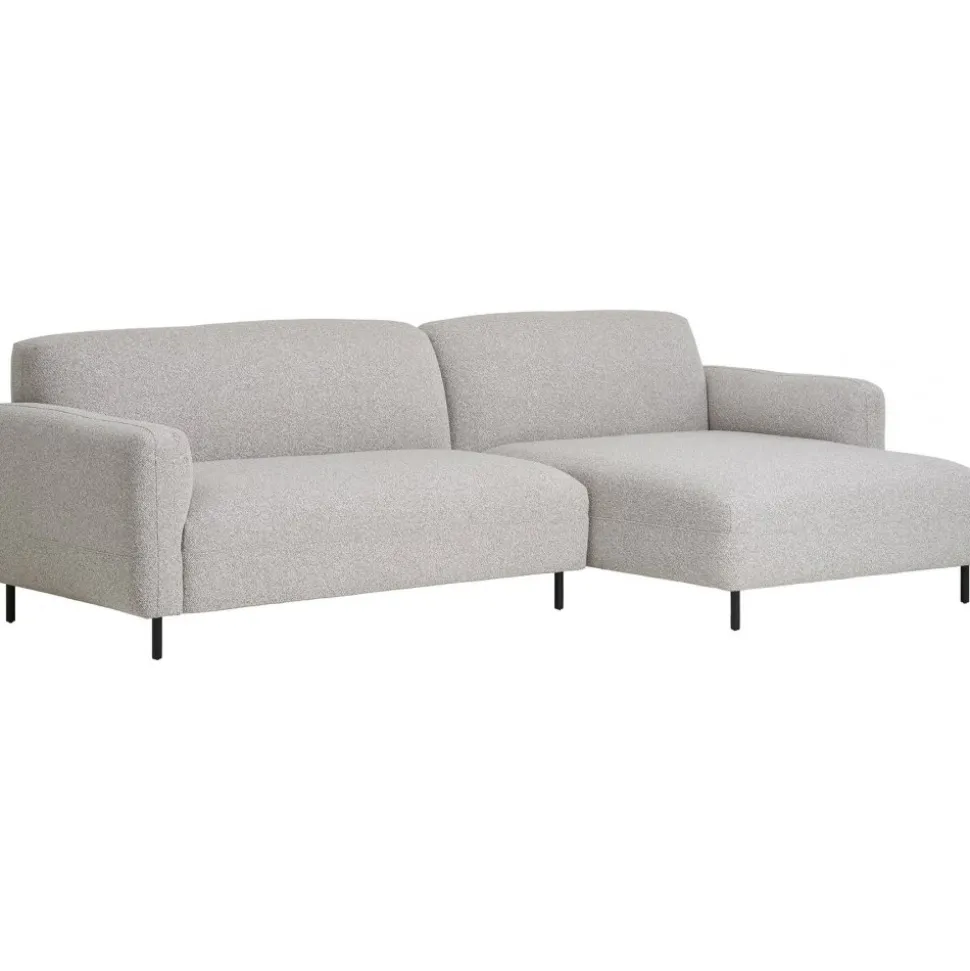 Divansoffa med klädsel av ljusgrått bouclétyg och ben av svart stål. Levereras monterad.