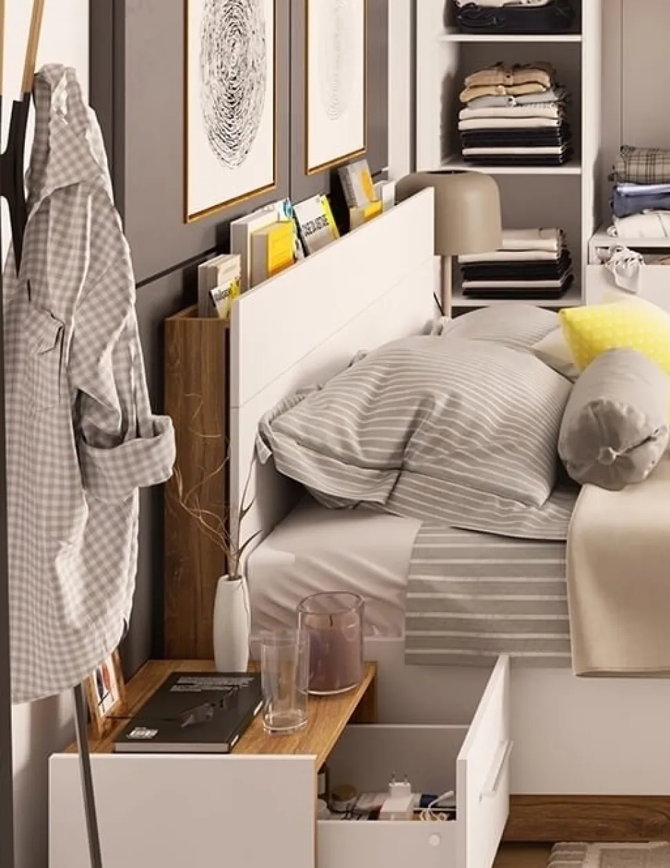 Säng av trä med förvaringsutrymme och integrerad sänggavel med LED-belysning. Gasfjädrar på båda sidor hjälper till att lyfta och hålla uppe ribbotten för åtkomst till förvaringsutrymmet. Levereras omonterad.