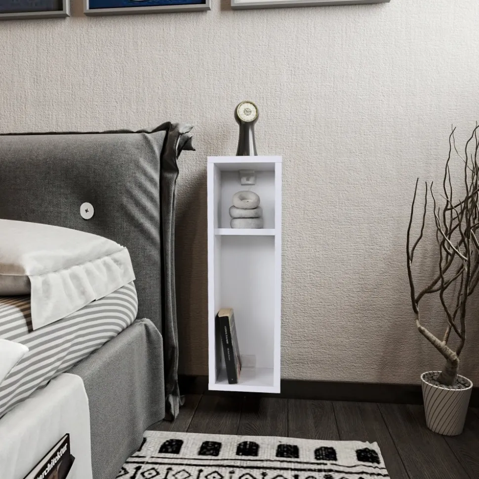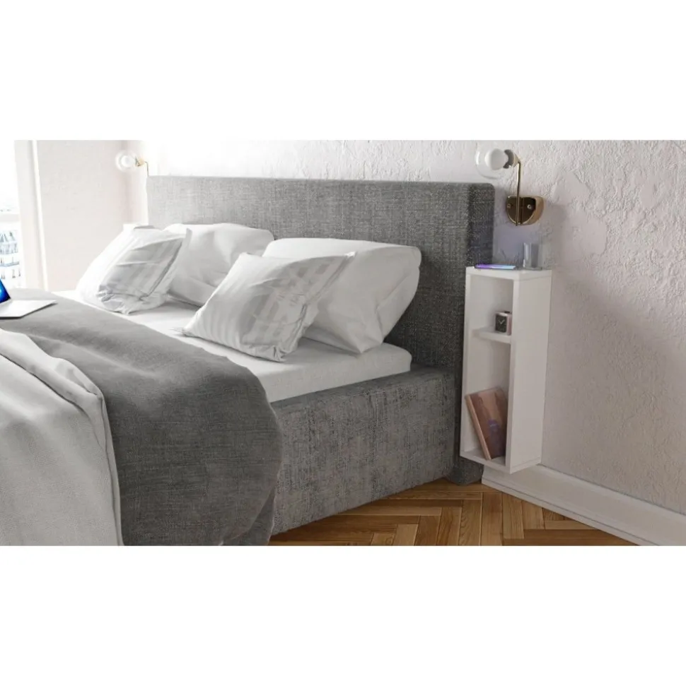 Turra vägghängt sängbord i vit melaminbelagd spånskiva ger ditt sovrum en ren och stilren look. Den minimalistiska designen gör det enkelt att inreda, samtidigt som det erbjuder en plats för lampor, böcker och andra nödvändigheter. Genom att montera bordet på väggen frigörs golvyta, vilket gör att rummet känns mer öppet och luftigt.