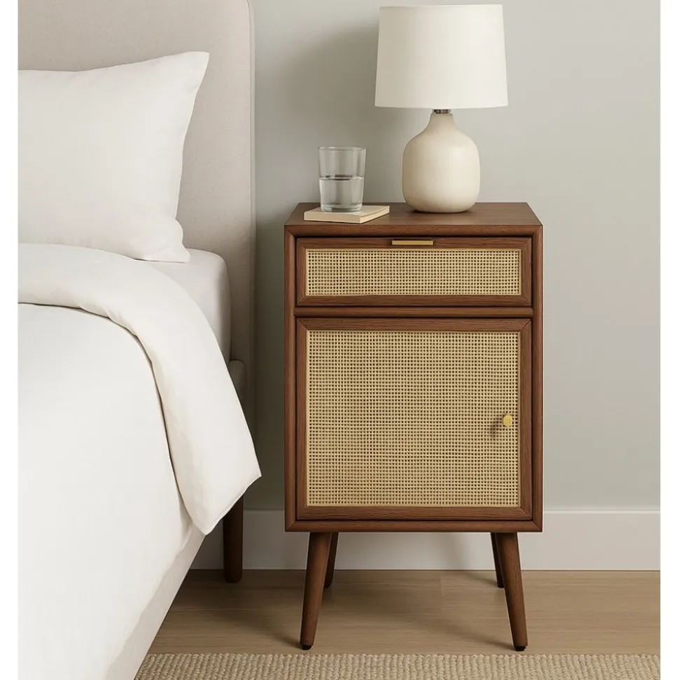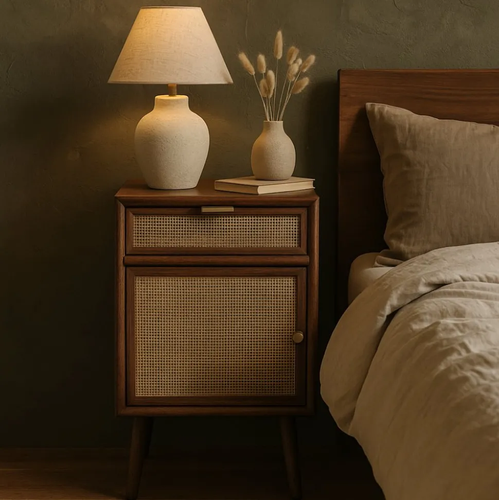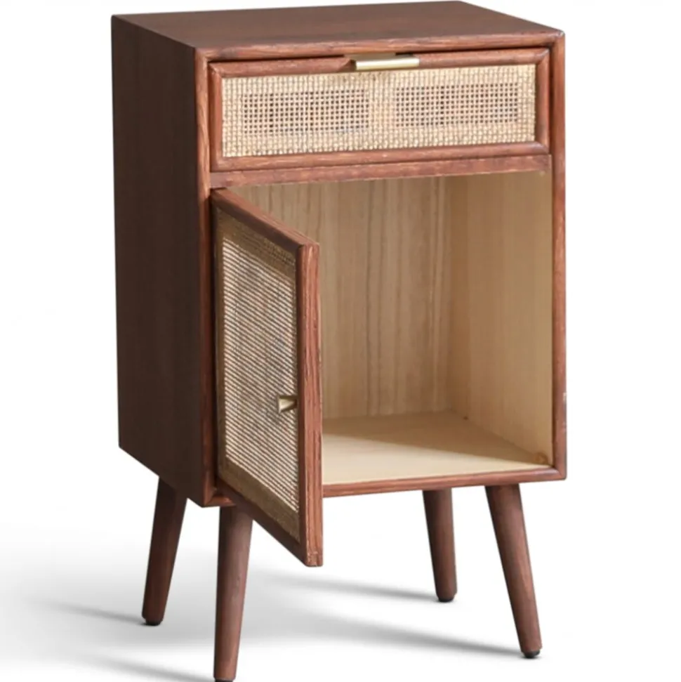 Sängbordet har charmiga fronter i ljus rotting som ger en luftig och naturnära känsla. Den unika kombinationen av materialen skapar en harmonisk balans och en smakfull detalj som verkligen lyfter inredningen i ditt rum.