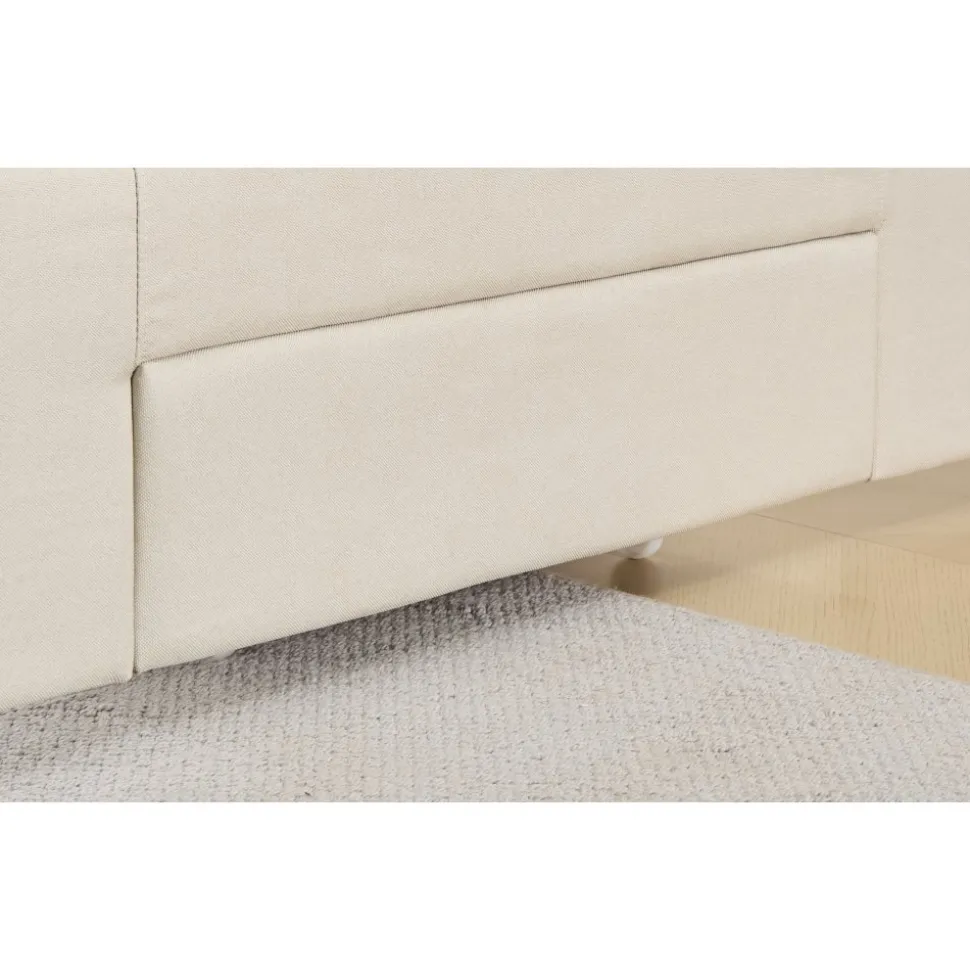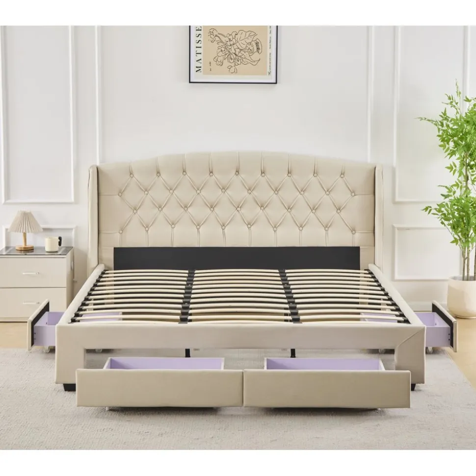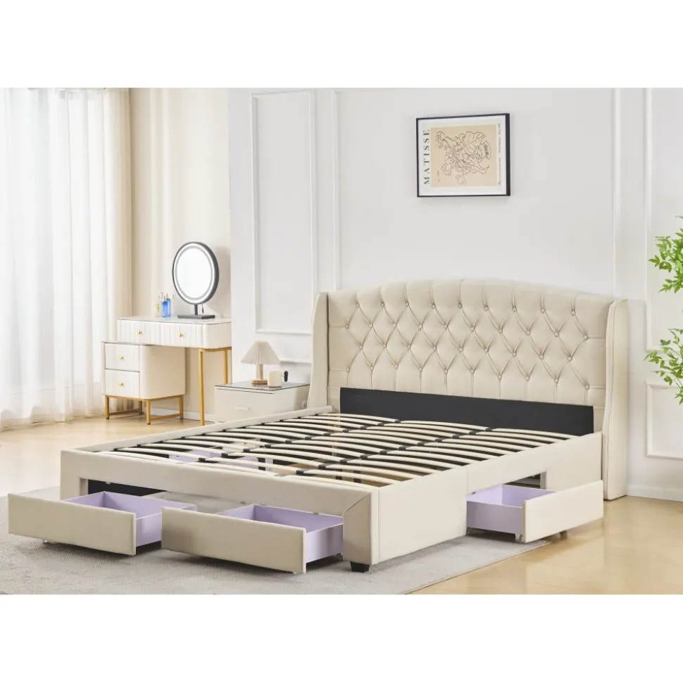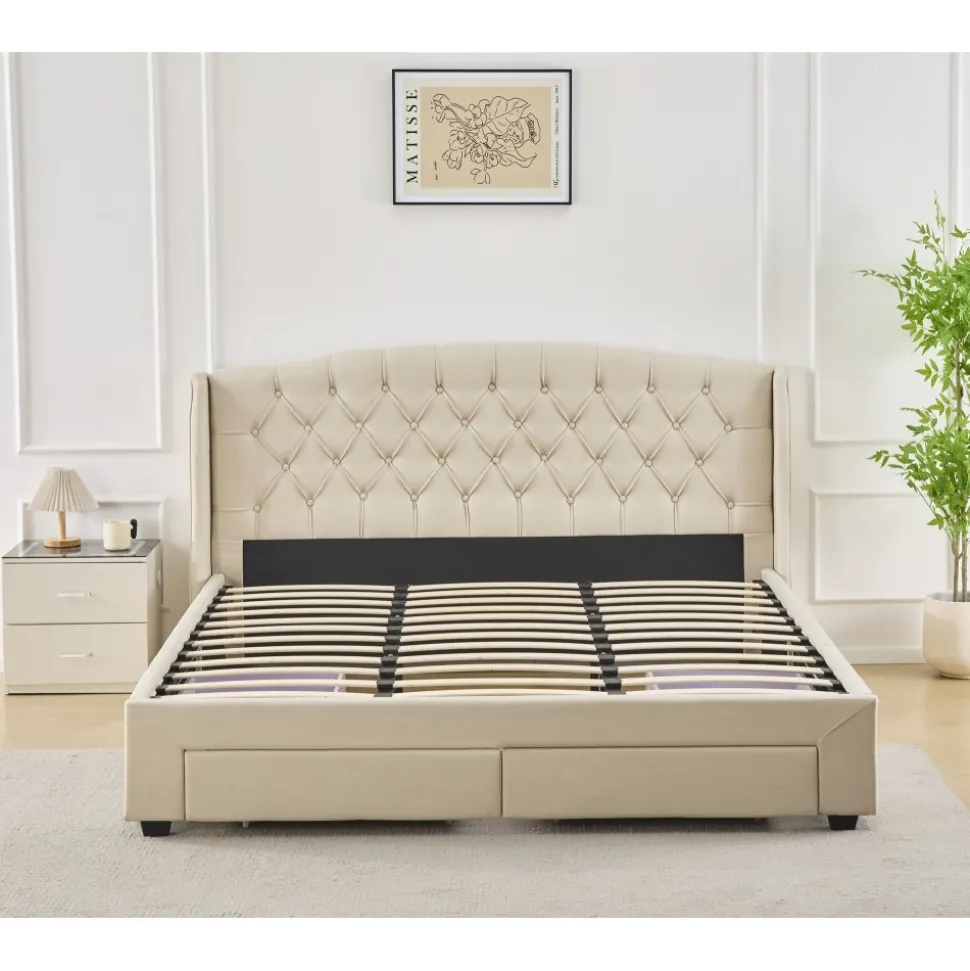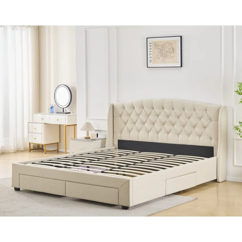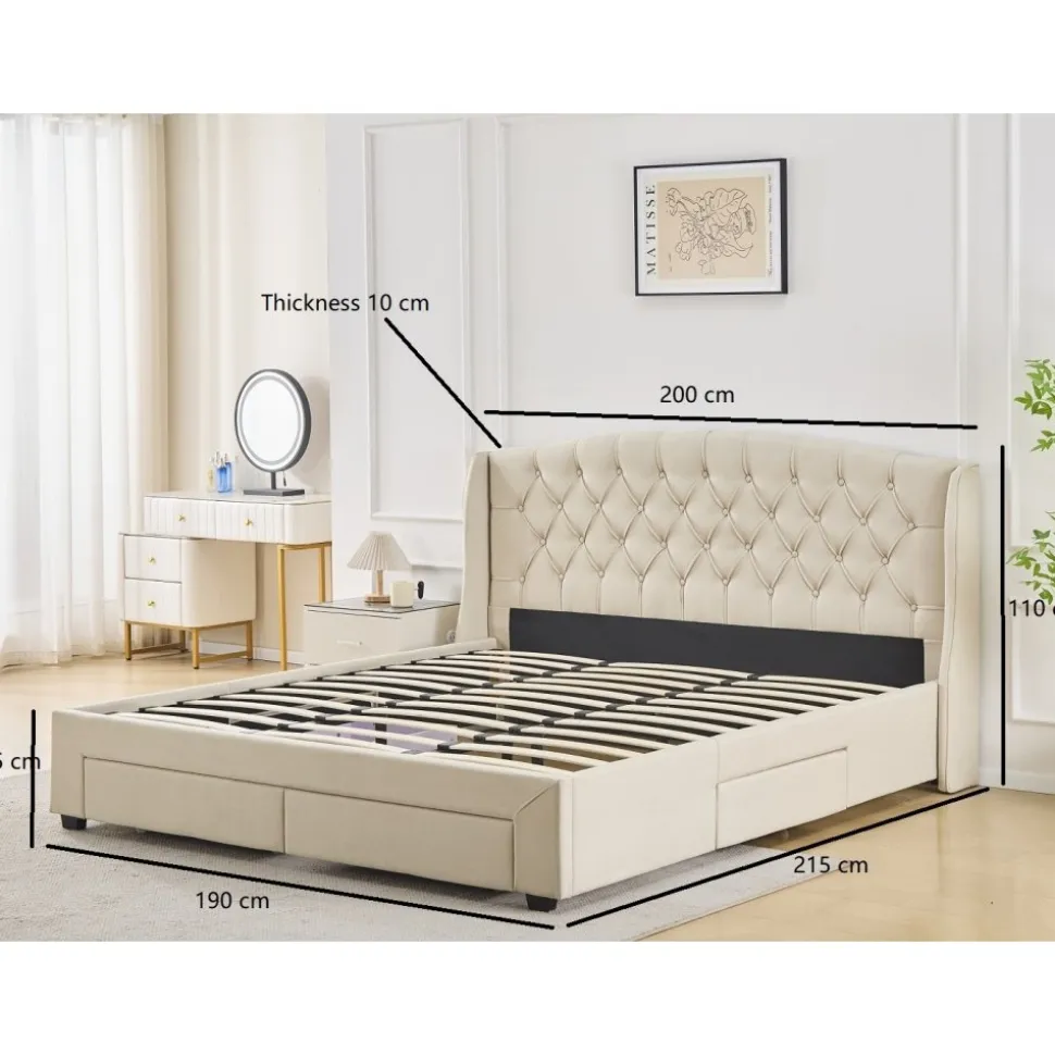 Lady med sänggavel och förvaring. Praktiska förvaringslådor finns inbyggda i sängramen. Komplett med arbetad och detaljrik sänggavel med knappar. Beige mjukt tyg.