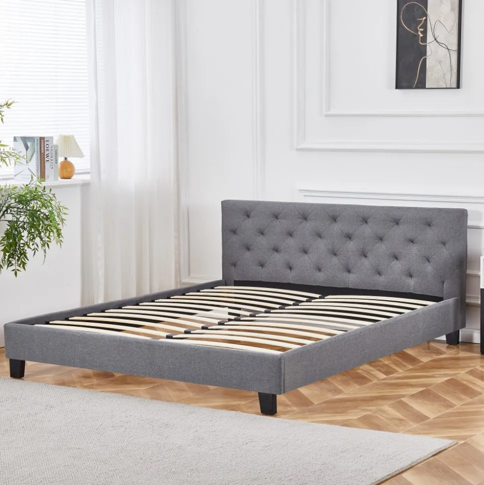 Tingsryd med djuphäftad sänggavel. Sängen och gaveln är klätt i ett grått tyg. Stomme av trä ribb-botten som ingår. Komplettera med en av våra sköna madrasser i måttet 180 x 200 cm.