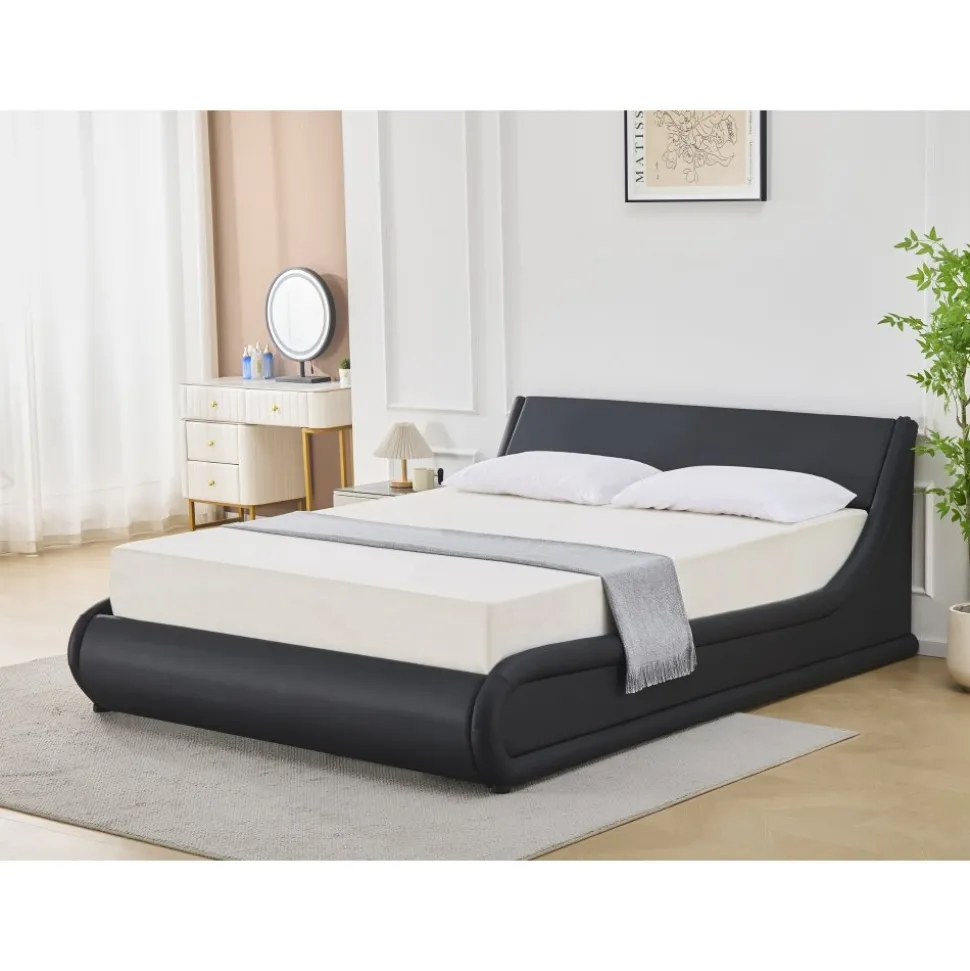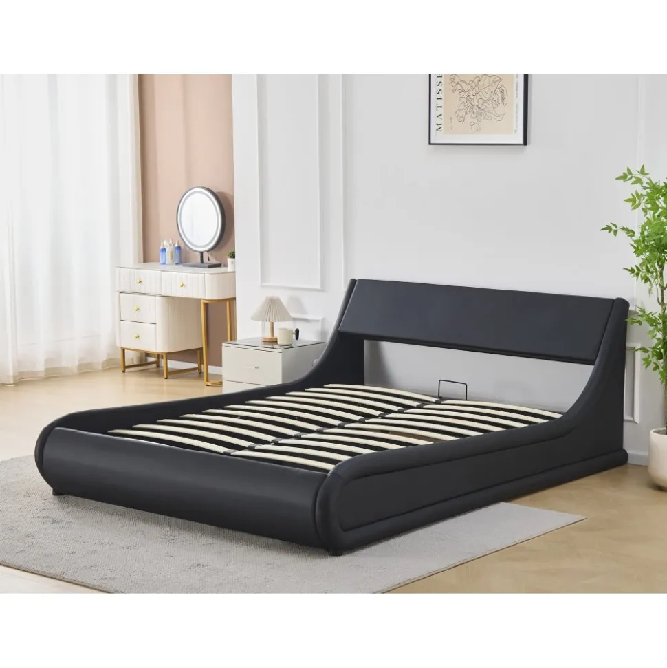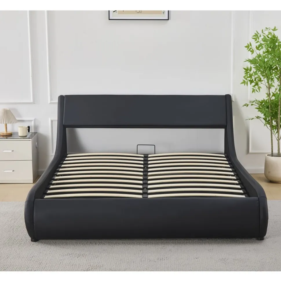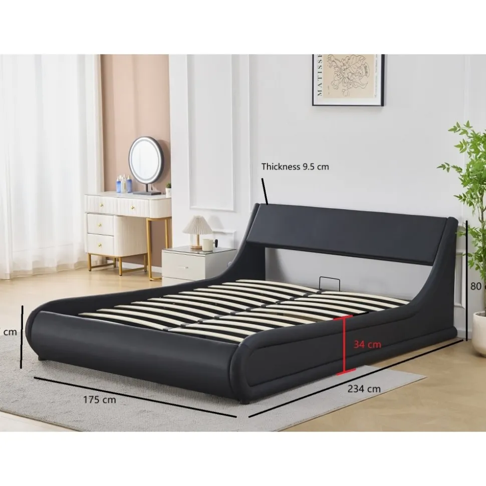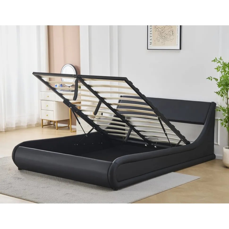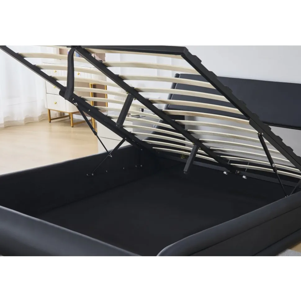 Prince inklusive sänggavel och förvaring. Klädsel av svart konstläder. Ribbor av plywood. Gasfjäder för att lyfta på bädden och ha stor och praktisk förvaring i sängen.