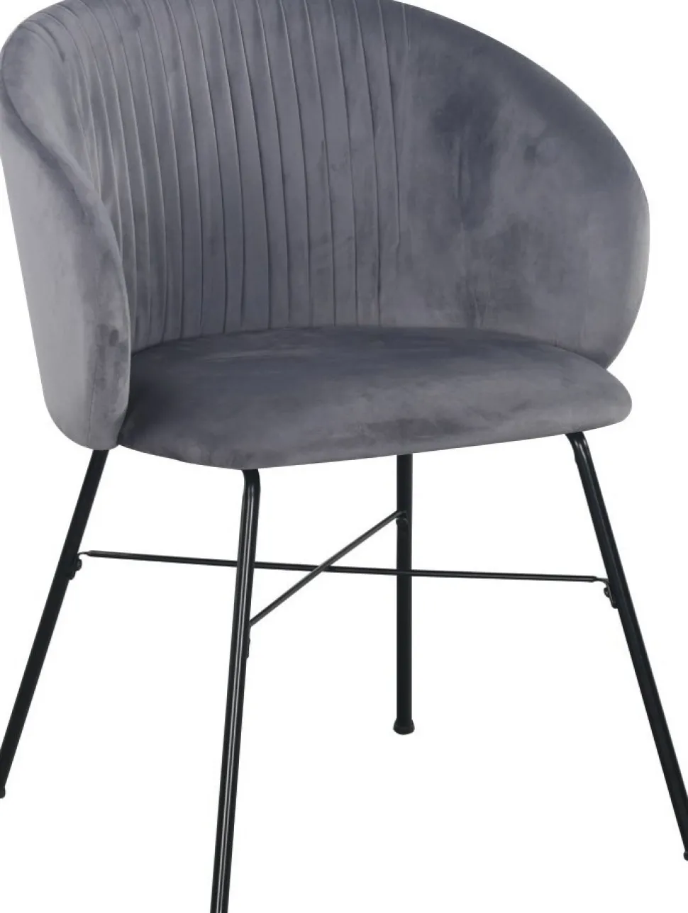 Modern karmstol med sits- och rygg klätt i ett snyggt och mjukt grått sammetstyg. Ben av svartlackad metall.