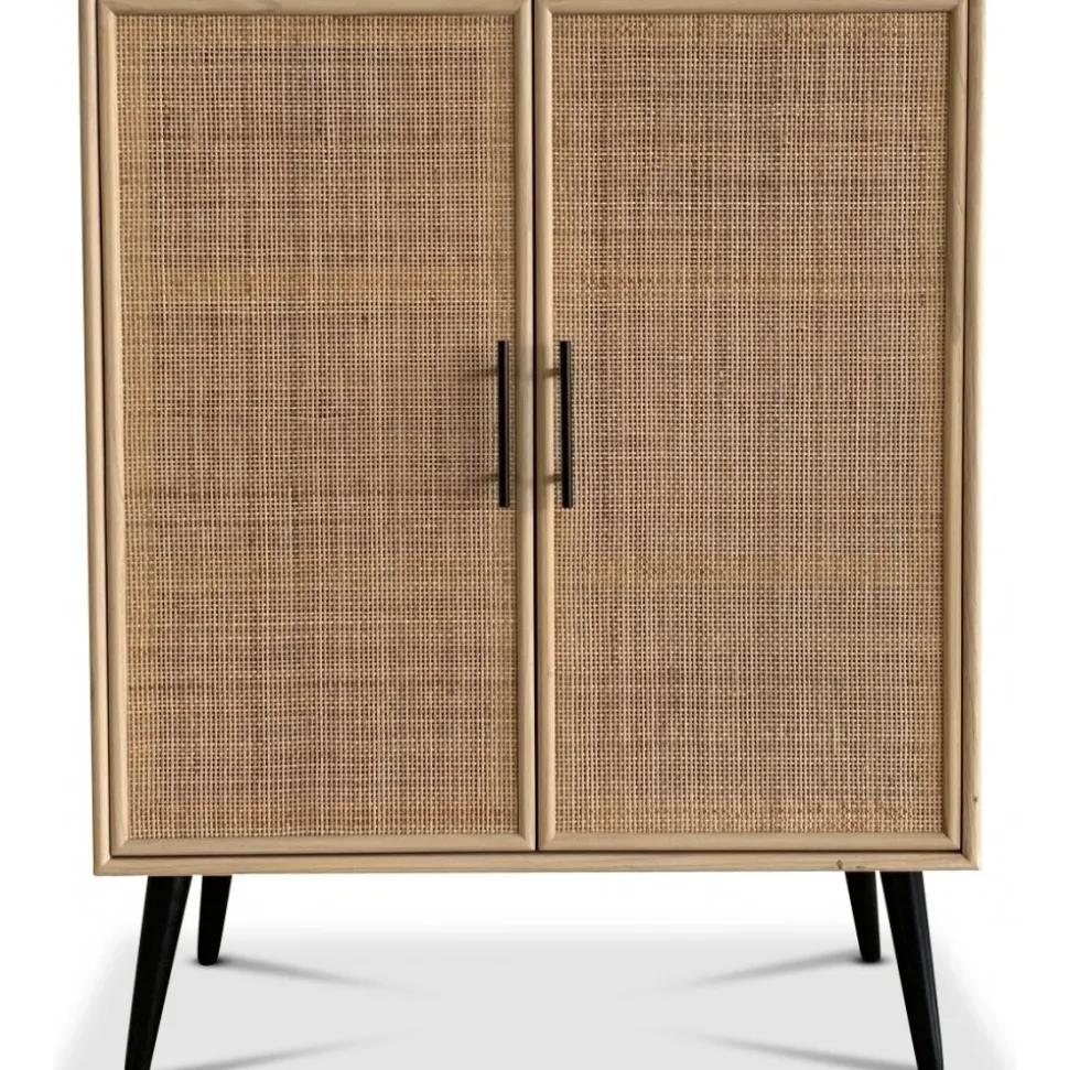Handgjort förvaringsskåp i trä och naturrotting som kombinerar traditionellt hantverk med modern, tidlös design. React-serien erbjuder unika möbler där varje tillverkas för hand, vilket ger en personlig karaktär och en naturlig variation i både träets struktur och rottingens mönster.