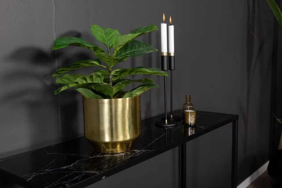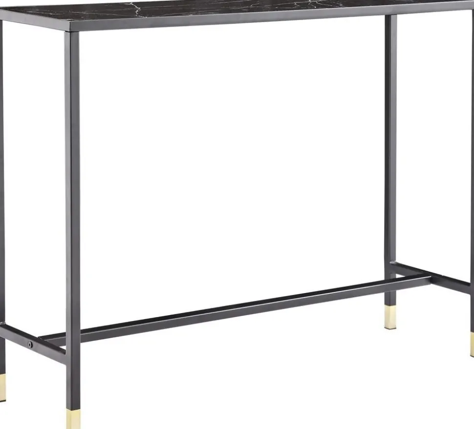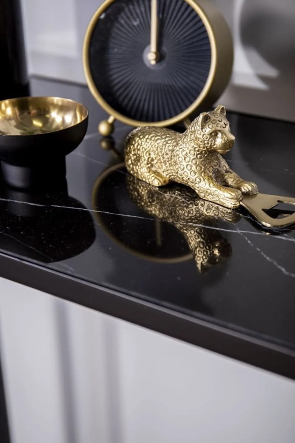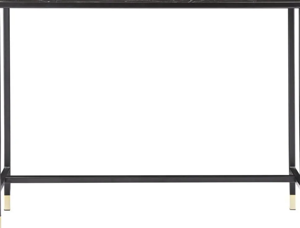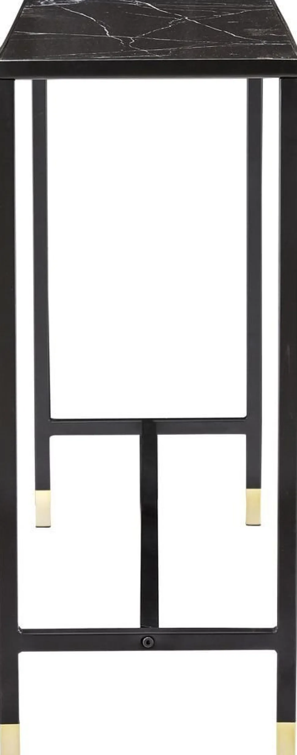 Avlastningsbord med svart mönstrad glasskiva och underrede i svart metall. Detaljer i mässing nertill av benen.