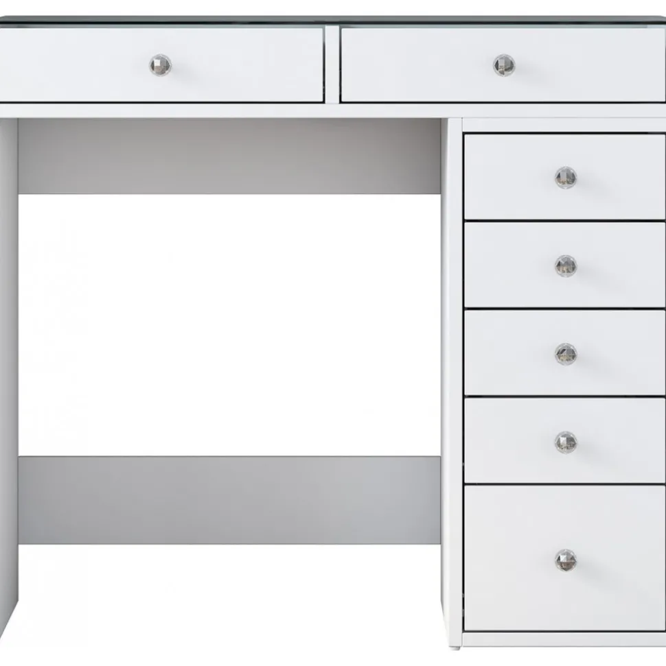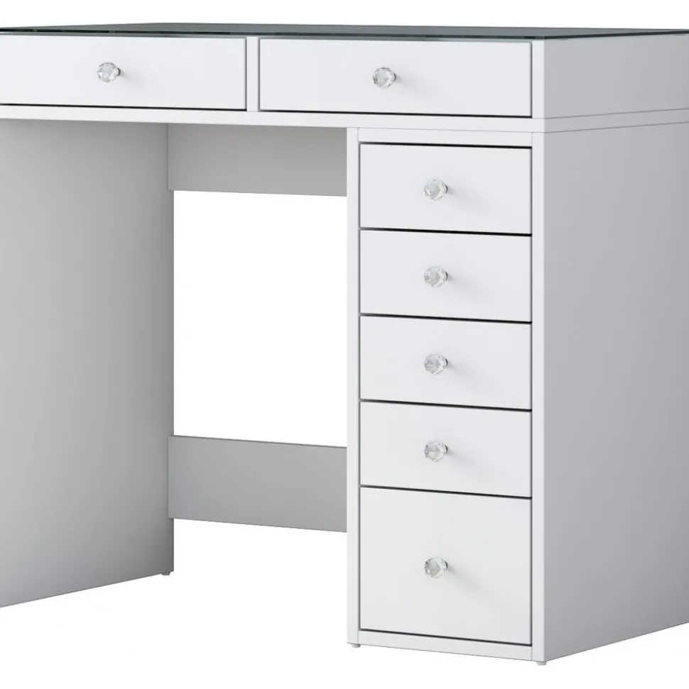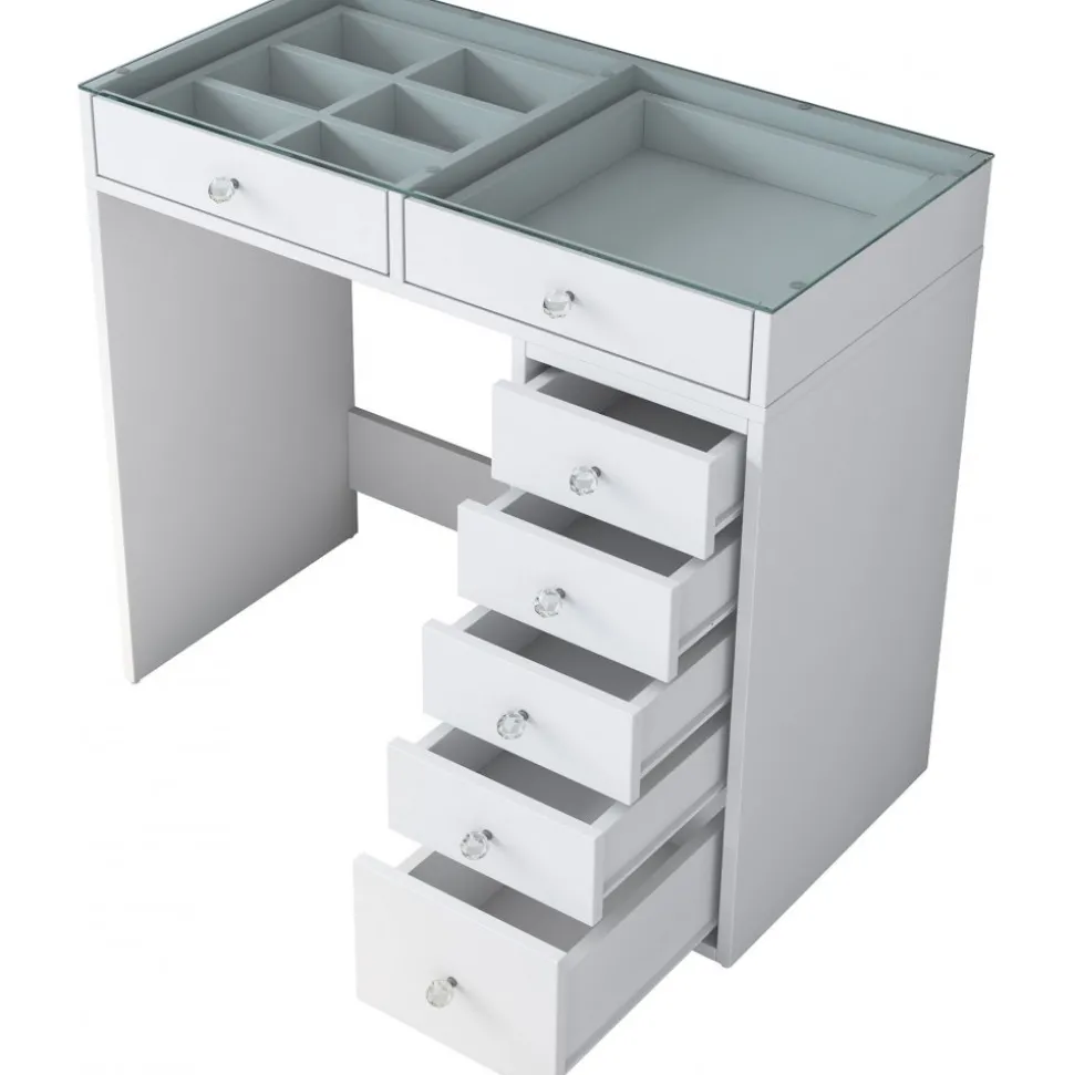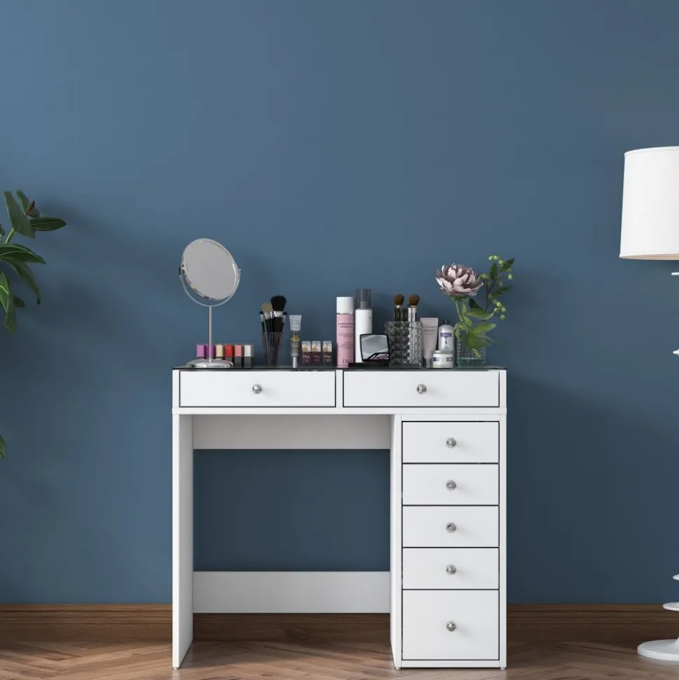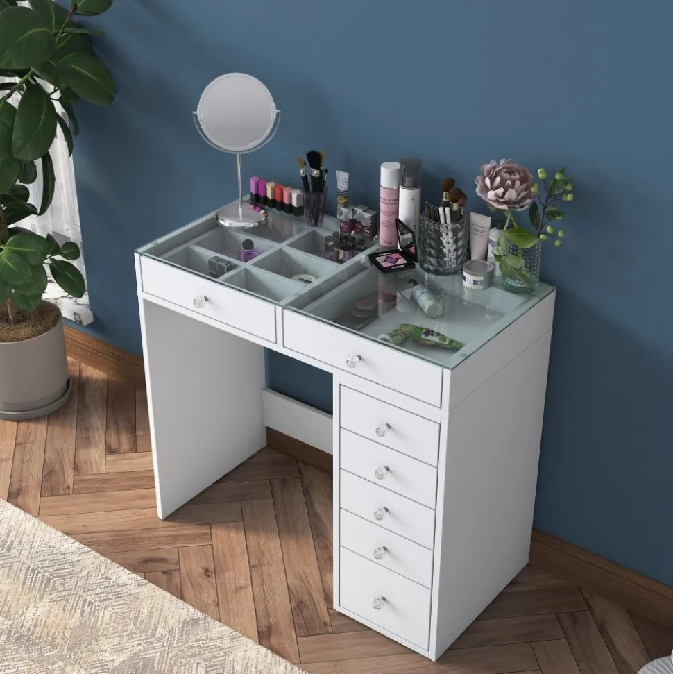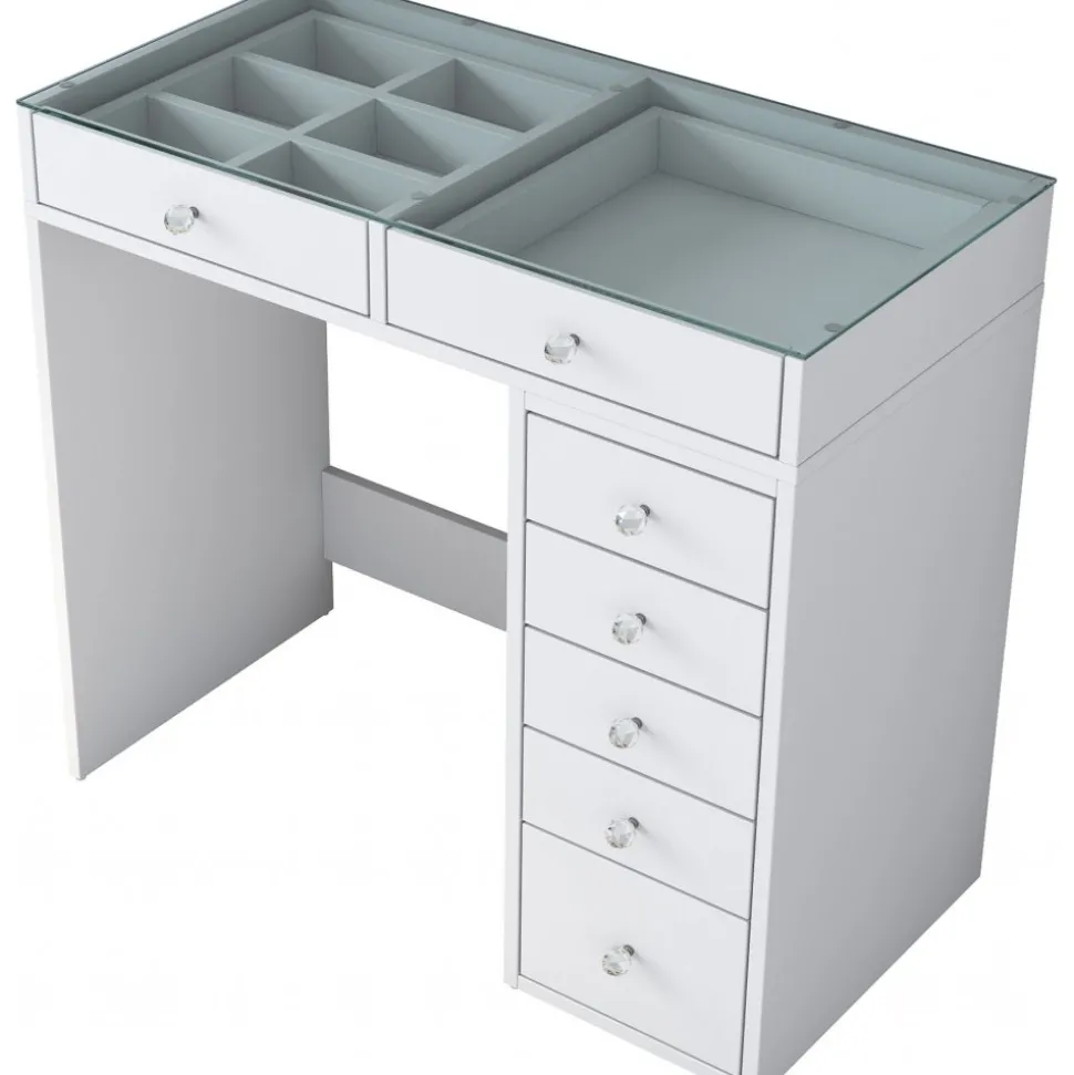Sminkbord av trä med bordsskiva av glas.