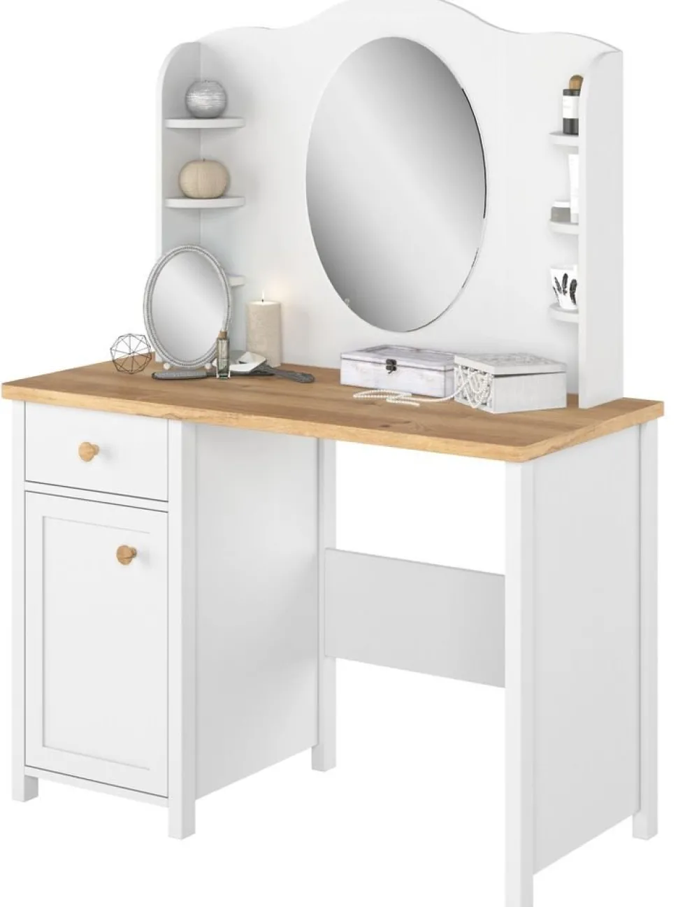 Ett mysigt sminkbord med en klassisk design. Tillverkad i MDF med goda förvaringsmöjligheter i form av en låda, ett skåp och ett flertal hyllplan på var sida av spegeln i mitten.