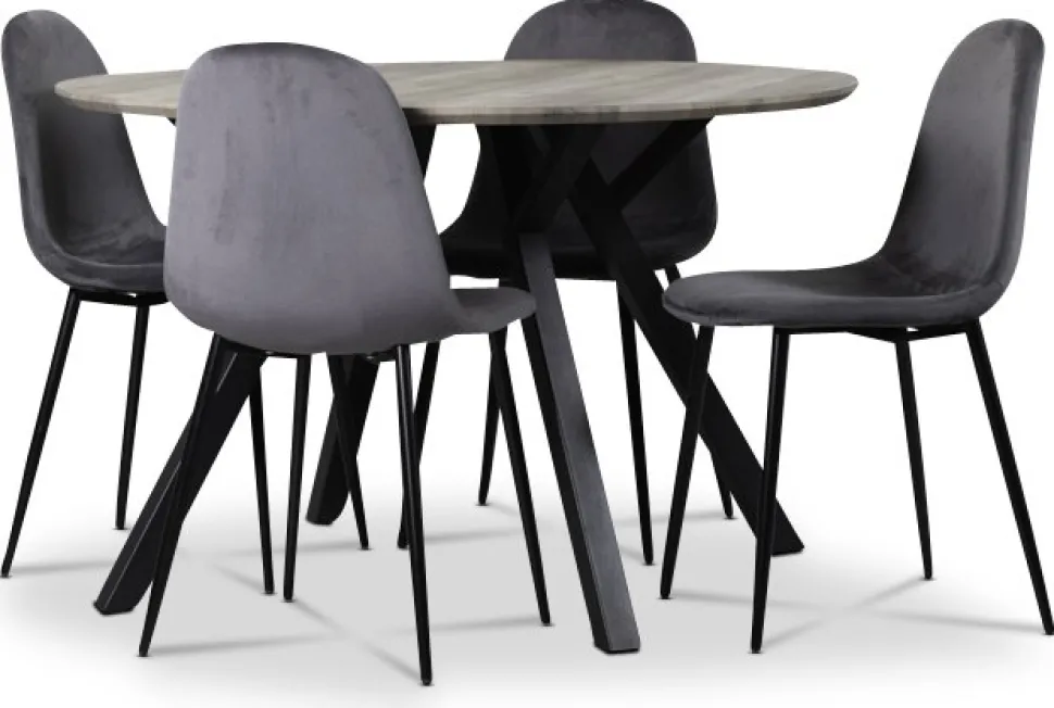 Matgrupp från Skånska Möbelhuset, Smokey matbord 120 cm i diameter med mdf-toppskiva med ljus betsad ekfoliering. Medföljer 4 st matchande Carisma sammetstolar i grått sammet med svarta ben.