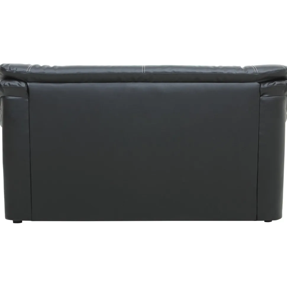 2-sits i svart konstläder som kombinerar stilren design med funktionella material som passar bra i både vardagsrum och mindre utrymmen. Soffan har en stadig stomme av eukalyptusträ och ben i tålig plast, vilket ger stabilitet och lång hållbarhet. Sitt- och ryggdynorna är stoppade med återanvänt skum för en bekväm sittupplevelse och ett mer hållbart materialval.