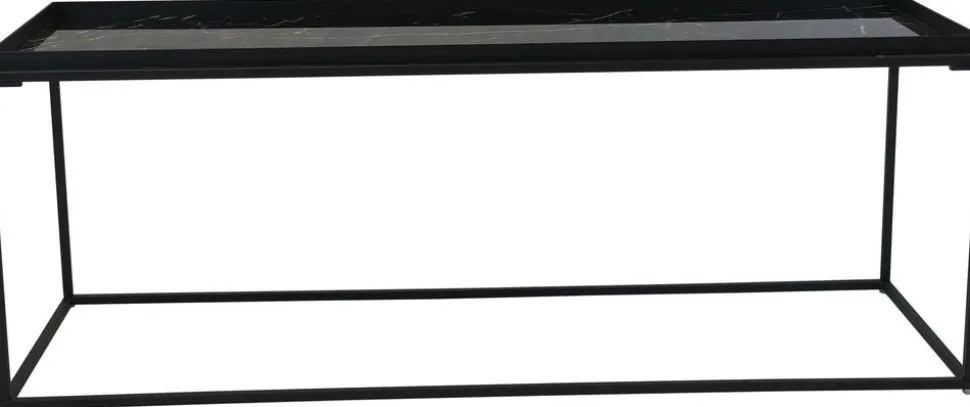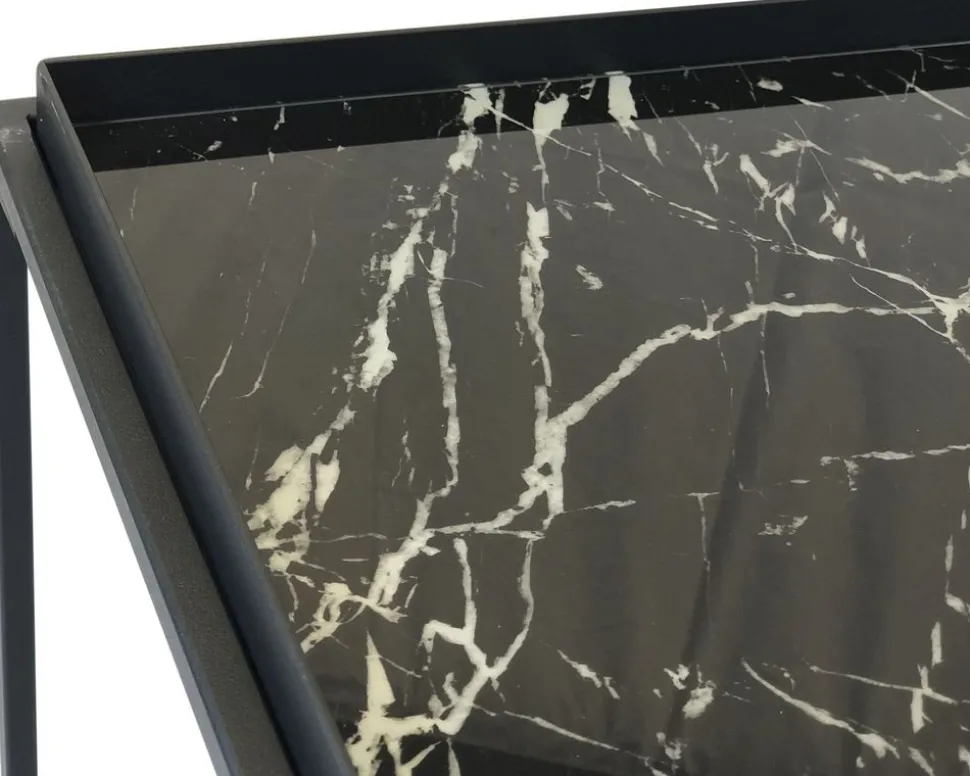Modernt i marmorlaminerat glas med underrede i svart pulverlackerad metall.