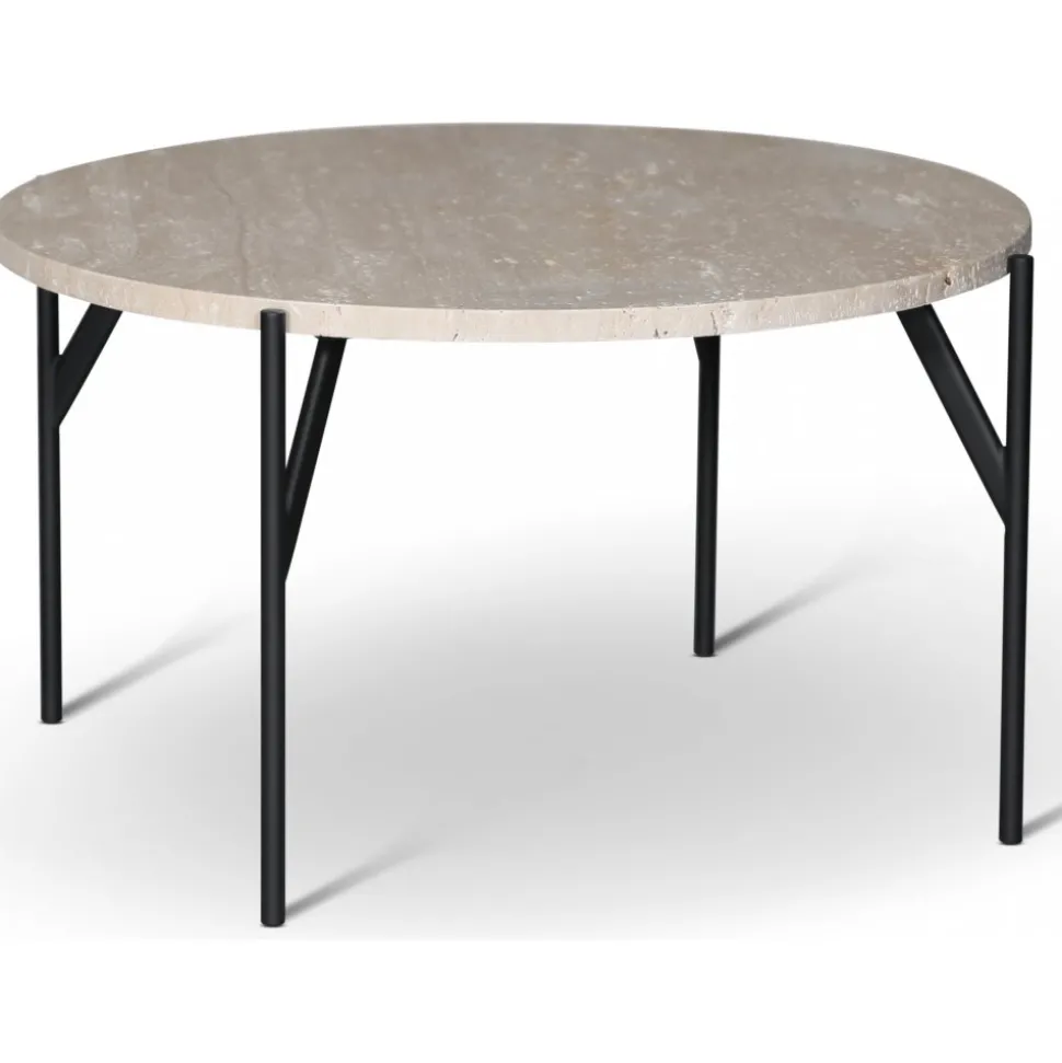 Ett snyggt med en lyxig modern känsla. Underredet är tillverkat av matt svart metall och bordsskivan är av äkta ljus kalksten, Travertin.