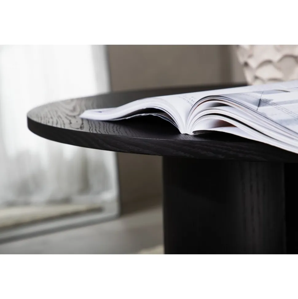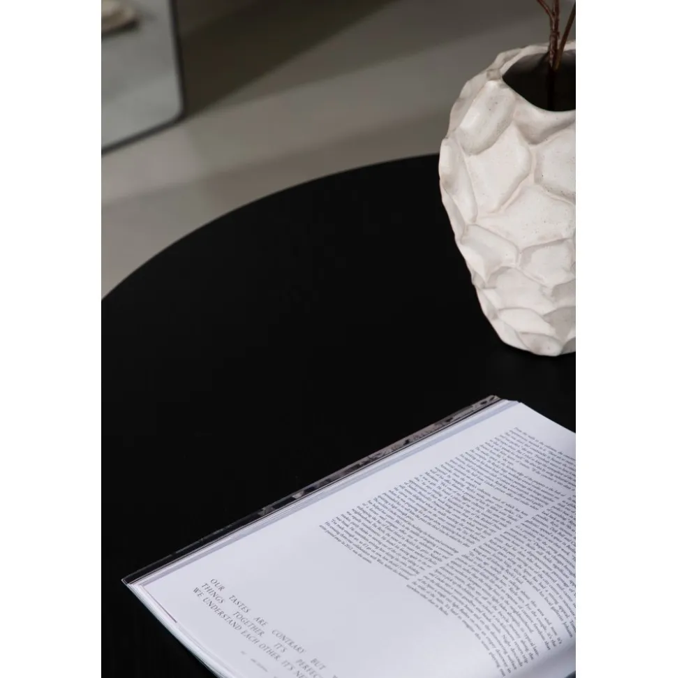Modernt som imponerar med sina mjuka former, stilrena design och trendsäkra kulör. Soffbordet är tillverkat i svart MDF med faner och har en cylinderformad uppbyggnad vilket skapar en läcker dimension till bordet. Den runda toppskivan är fanerad och stommen utgörs av tre cylinderformade ben, samlade under bordets mitt. Bordet är otroligt användbart både som soffbord eller sidobord och den nätta storleken gör bordet enkelt att placera och flytta runt i hemmet.