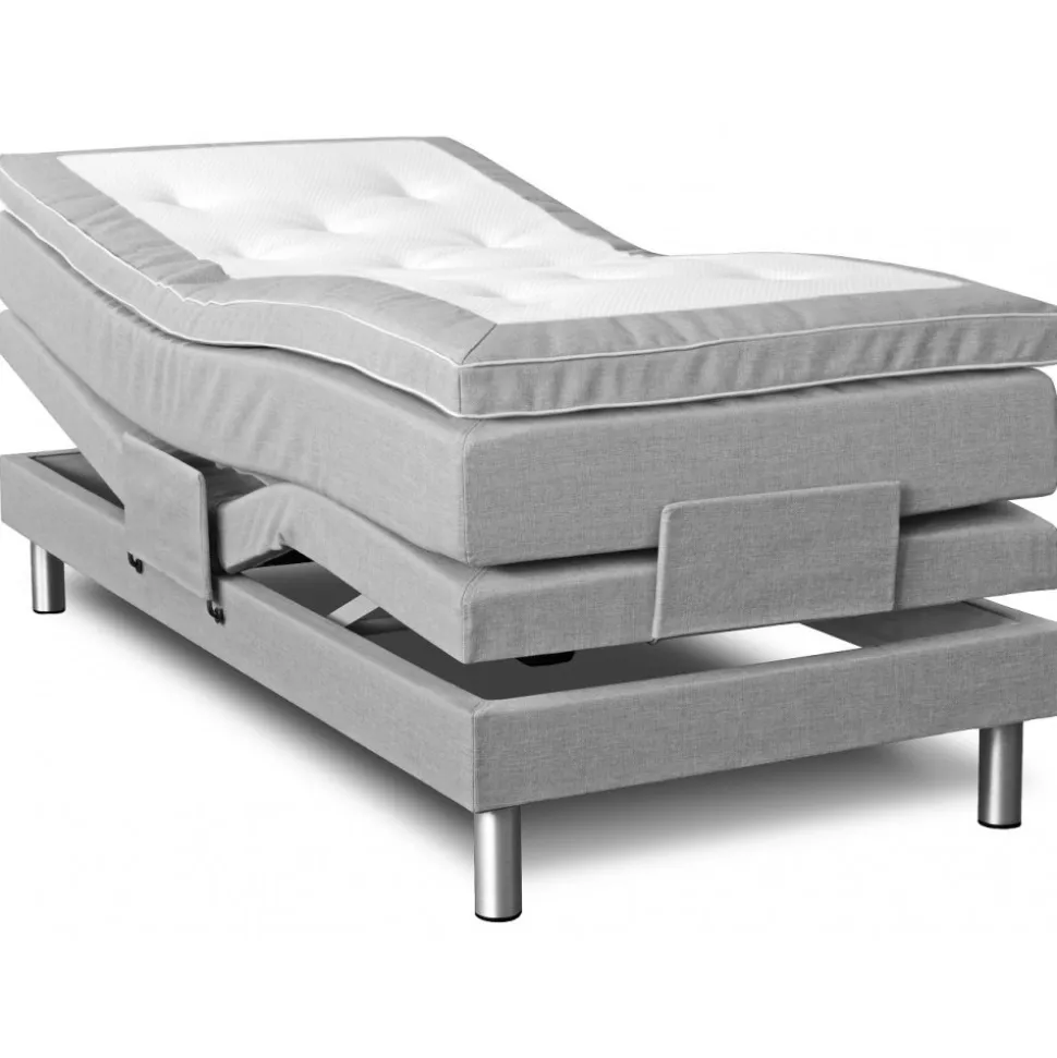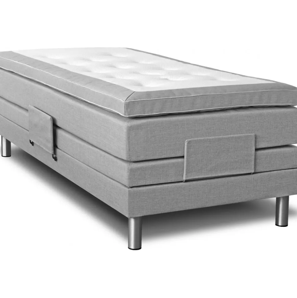 Cloud ställbar säng levereras med en 8 cm hög exklusiv bäddmadrass. Sängen är klädd i ett ljusgrått slitstarkt tyg (Rocco BEJ570).