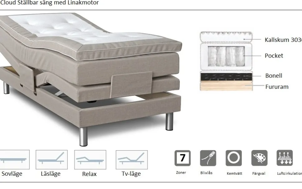Ställbar motorsäng Cloud med en hög kvalitet tackvare Linak motor och kraftig ram. Cloud är vår lyxigaste och mest påkostade motorsäng. Vi levererar sängen med en lyxig, pikerad och skön bäddmadrass i Kallskum 3030. Inbyggda luftkanaler i bäddmadrassen ger cirkulation och en bättre sömn. Sängen har ett följsamt 7-zons pocket fjädersystem som ger en skön komfort för kroppen. Den fingerskarvade bottenramen är 12 cm hög och byggd i europaproducerad furu. Även underbädden har ett fjädersystem.