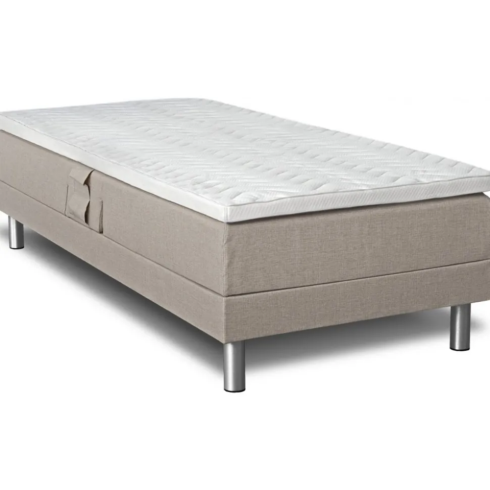 Comfort levereras med en 6 cm hög bäddmadrass i quiltat vitt tyg. Sängen är klädd i ett sandfärgat slitstarkt tyg (Inari 22).