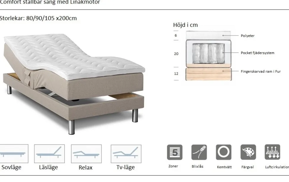 Ställbar motorsäng Comfort med en hög kvalitet tackvare Linak motor och kraftig ram. Vi levererar sängen med en lyxig, quiltad och skön bäddmadrass i Polyeter. överdraget på bäddmadrassen går att ta av och kemtvätta. Inbyggda luftkanaler i bäddmadrassen ger cirkulation och en bättre sömn. Sängen har ett följsamt pocket fjädersystem som ger en skön comfort för kroppen. Den fingerskarvade bottenramen är 12 cm hög och byggd i europeisk fur.
