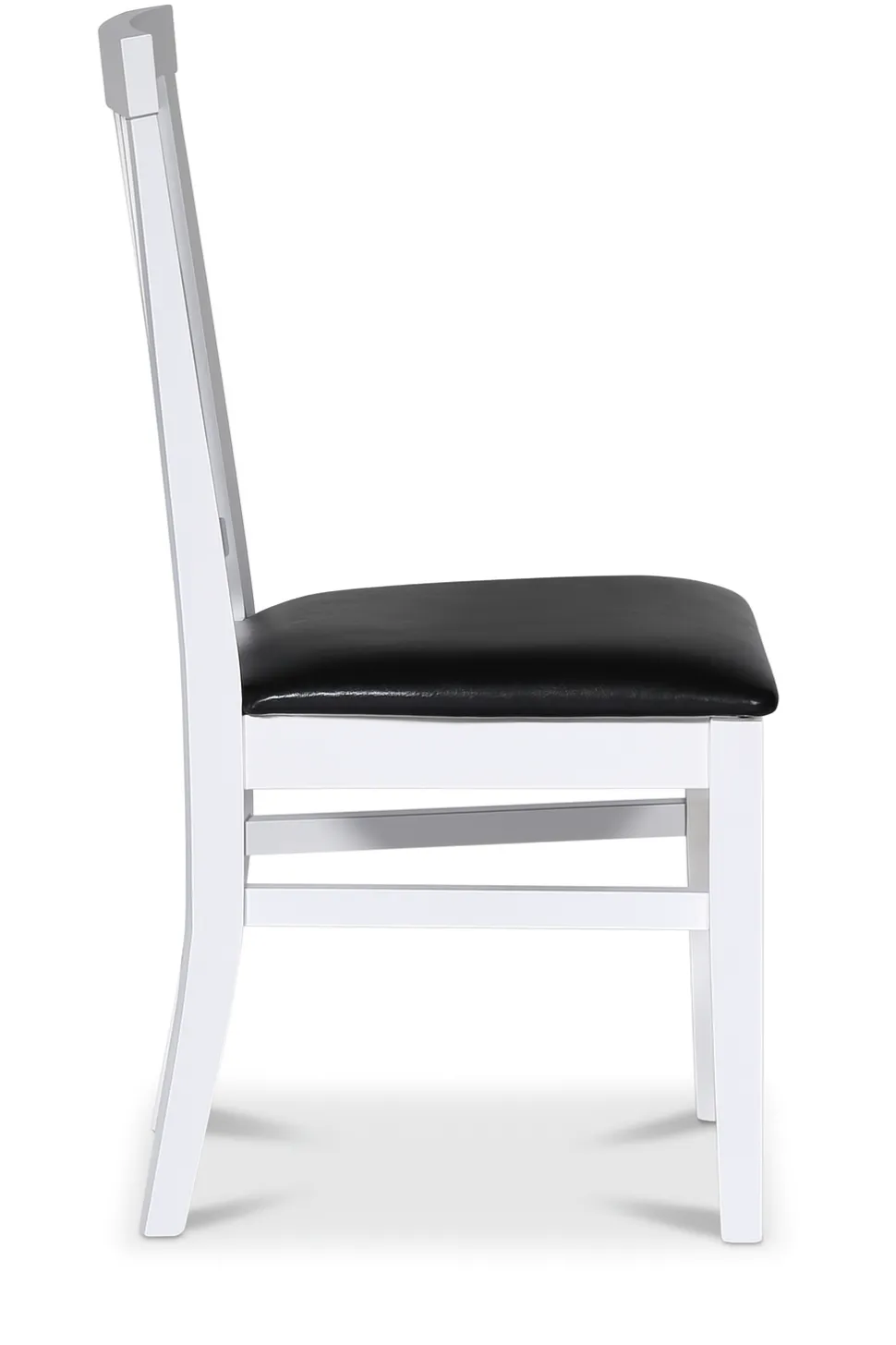Våra matrums serier Fårö, Skagen och Dalarö är utformade i klassisk design där stilren design möter kvalitet. Denna med stomme i vitlackat massivt trä med sits i svart tålig PU. Matstol med raka ribbor i ryggen som en klassisk detalj.