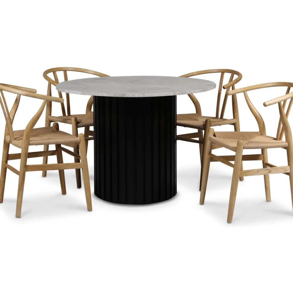 - Sumo matgrupp Ø105 cm inkl. 4 st Brandon matstol – Svartbets / Silver marmor