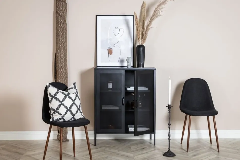 Tåby är en serie i pulverlackerad metall med nätade dörrar i metall och generöst med frihöjd under skåpet. Perfekt för att delvis dölja det som förvaras men ändå kunna ana vad som finns där.