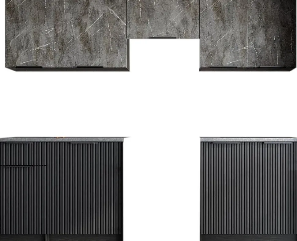 De grå marmormönstrade och svarta fronterna ger en lyxig och samtida look, medan den robusta stommen i svart skapar en stilren kontrast. Bänkskivan i grå nyans är 28 mm tjock och tillverkad för att tåla daglig användning samtidigt som den förstärker kökets eleganta uttryck.