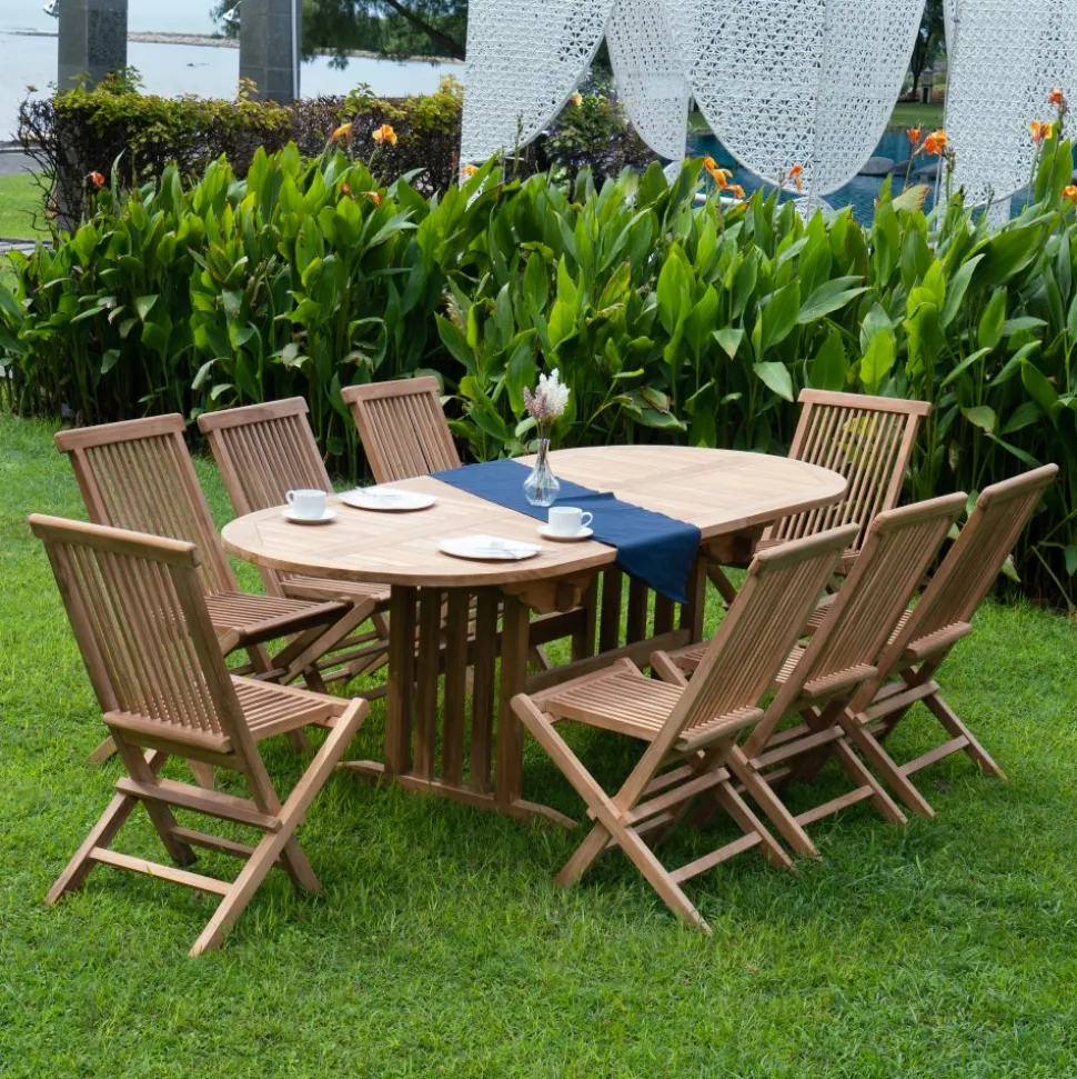Saltö matgrupp för uteplatsen med ett förlängningsbart matbord i massiv teak, tillsammans med 8 stycken Saltö stolar i massiv teak. En modern kombination på uteplatsen.
