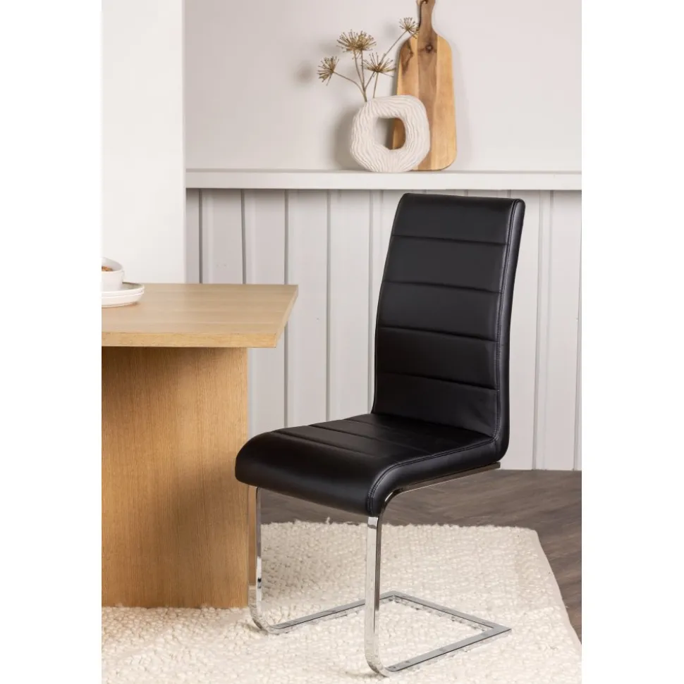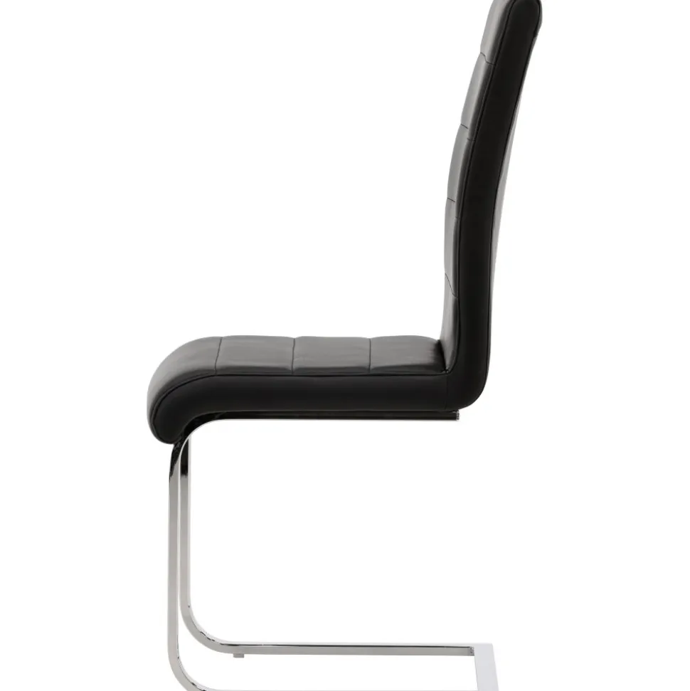 Matstol som har en trendig design med raka nordiska former och dekorativ stomme. Stolen är i svart konstläder med kromade metallben. Benens design gör att stolen sviktar behagligt och ger dig ett skönt gung. Matcha med ett pampigt matbord så får du en komplett matgrupp att pryda hemmets hjärta med!