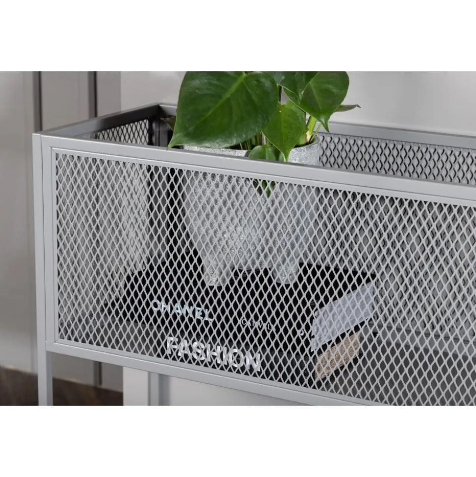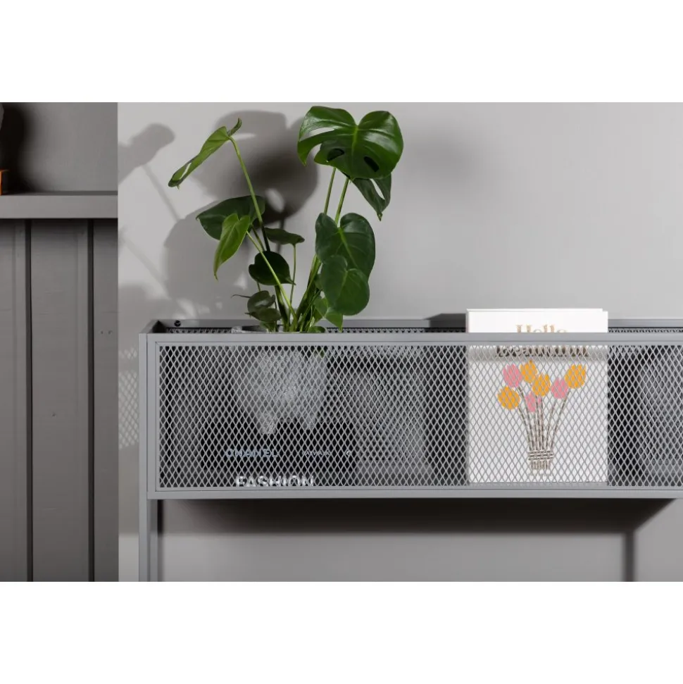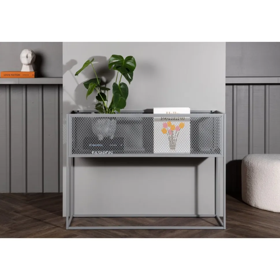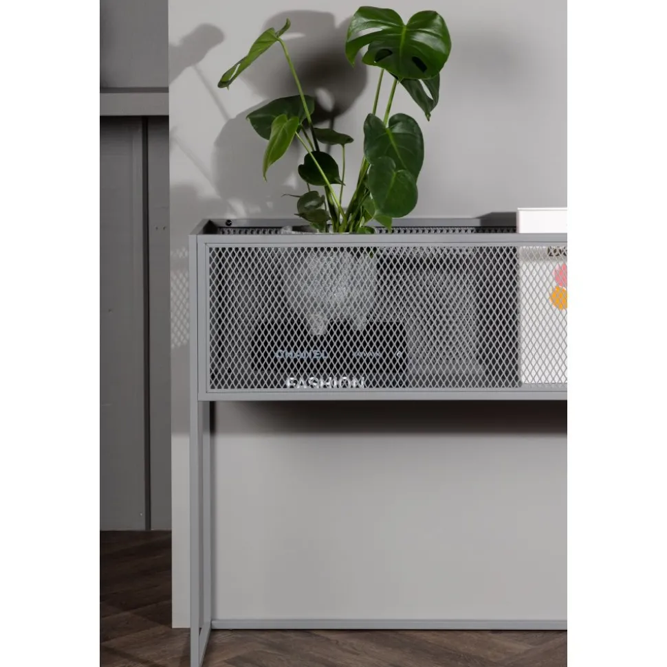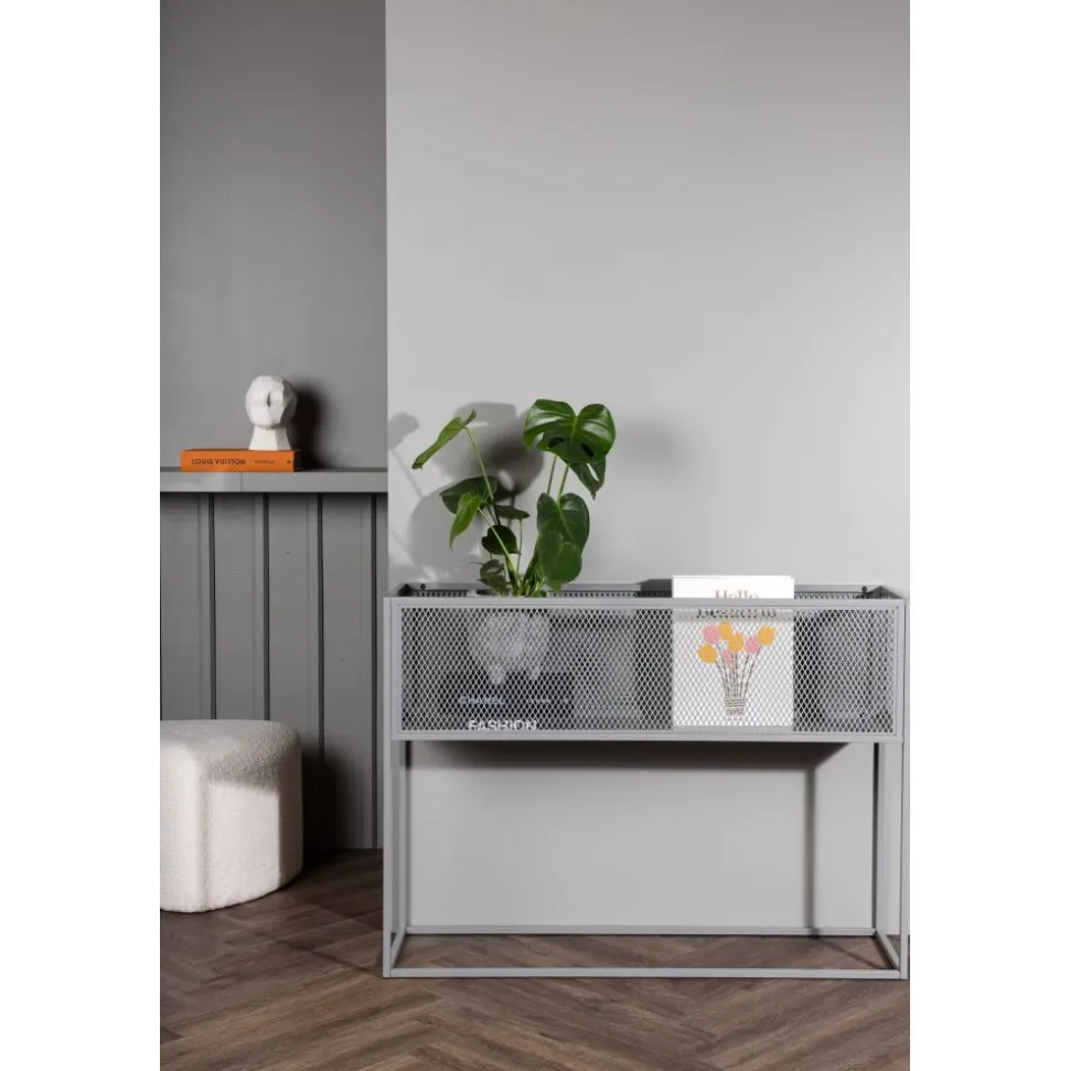 Möblera hemmet modernt och smart med hjälp av Teo avlastningshylla. Det här läckra sidobordet/hyllan har en smäcker industriell design med ett hyllplan för förvaring, nätsidor omkring hela förvaringsytan och smala höga ben i grått stål. Skåpets smidiga storlek och eleganta utsida gör den lättplacerad och passar bra in i de flesta rum i hemmet, så möblera efter egna behov och önskemål och pryd med vackra dekorationer, blommor eller annat som måste förvaras – bara fantasin sätter gränser.