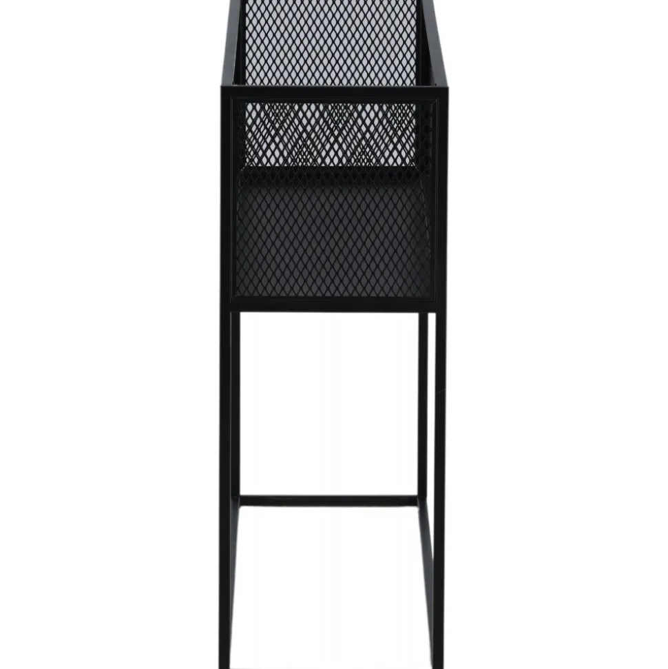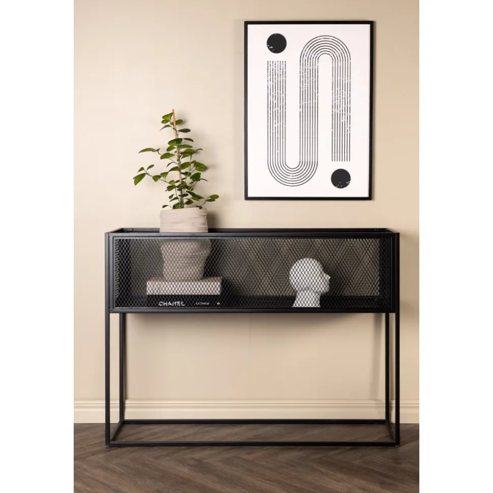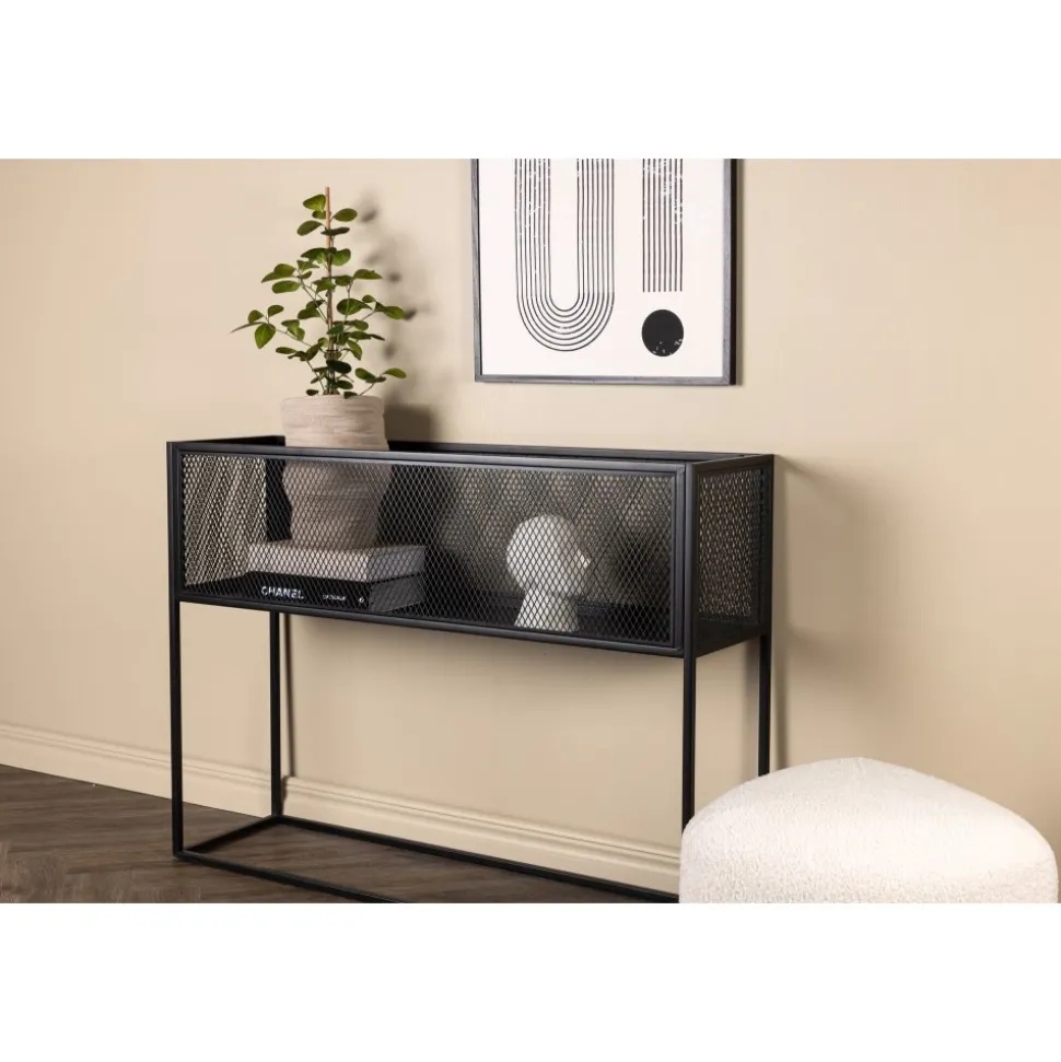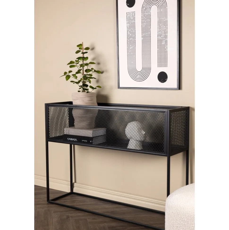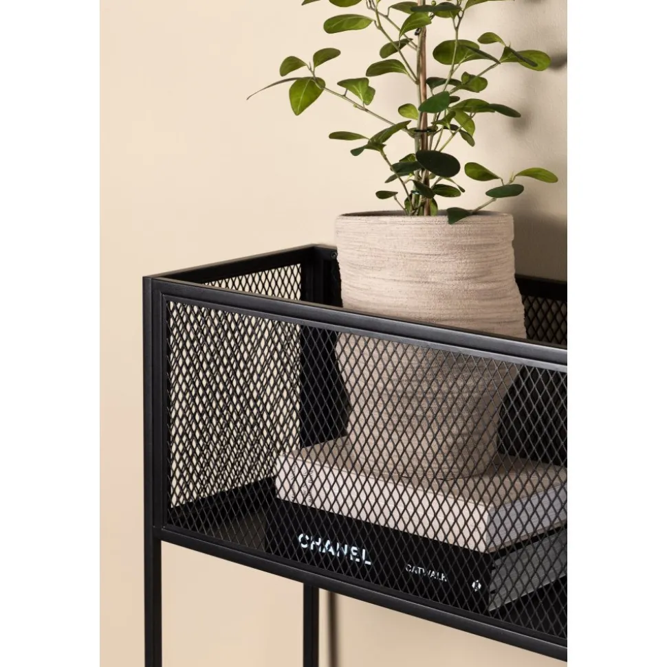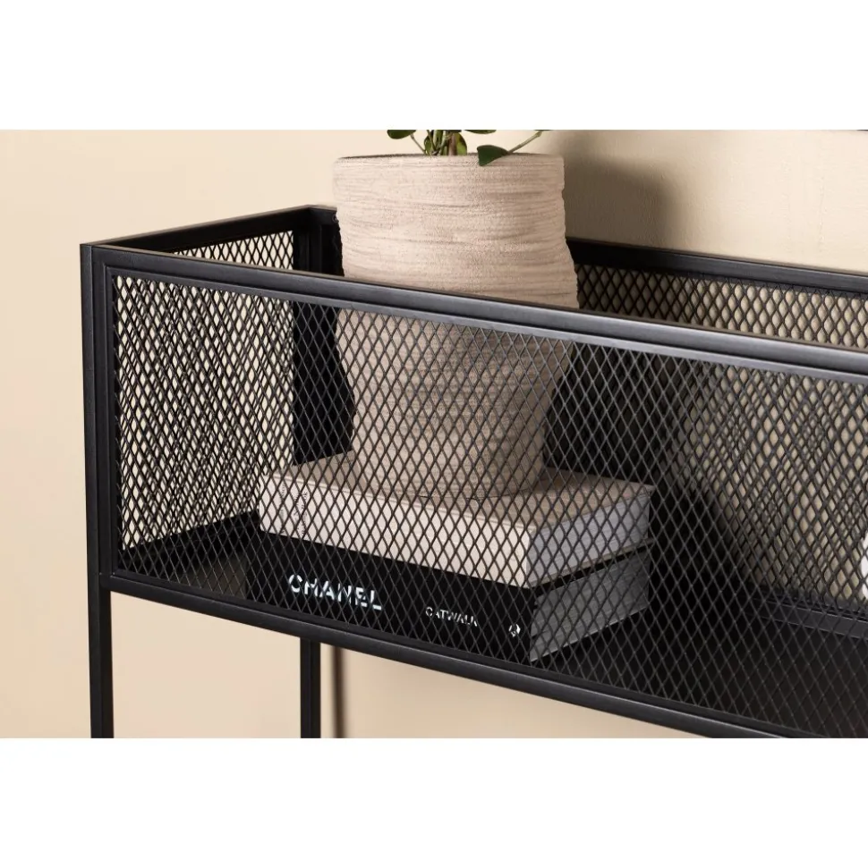 Möblera hemmet modernt och smart med hjälp av Teo avlastningshylla. Det här läckra sidobordet/hyllan har en smäcker industriell design med ett hyllplan för förvaring, nätsidor omkring hela förvaringsytan och smala höga ben i svart stål. Skåpets smidiga storlek och eleganta utsida gör den lättplacerad och passar bra in i de flesta rum i hemmet, så möblera efter egna behov och önskemål och pryd med vackra dekorationer, blommor eller annat som måste förvaras – bara fantasin sätter gränser.
