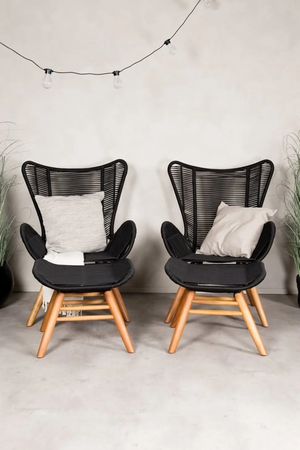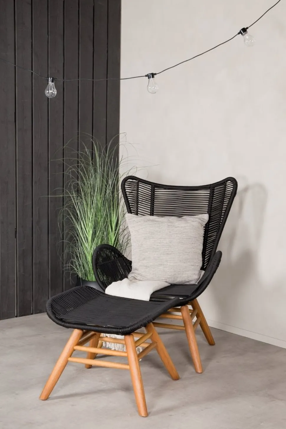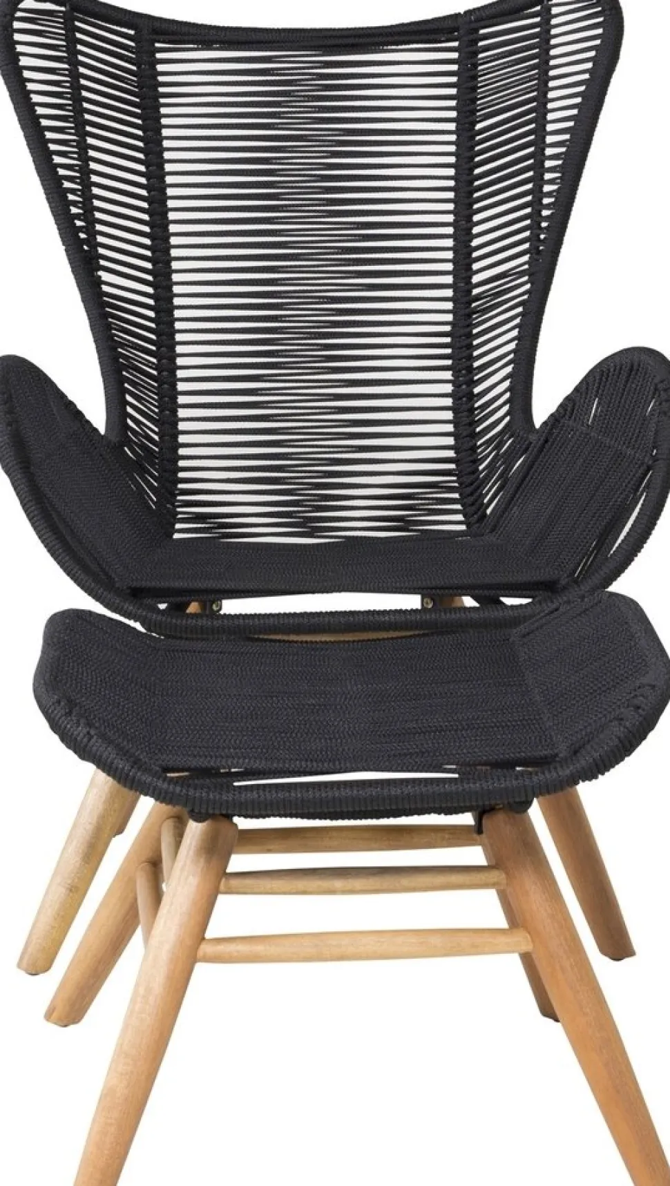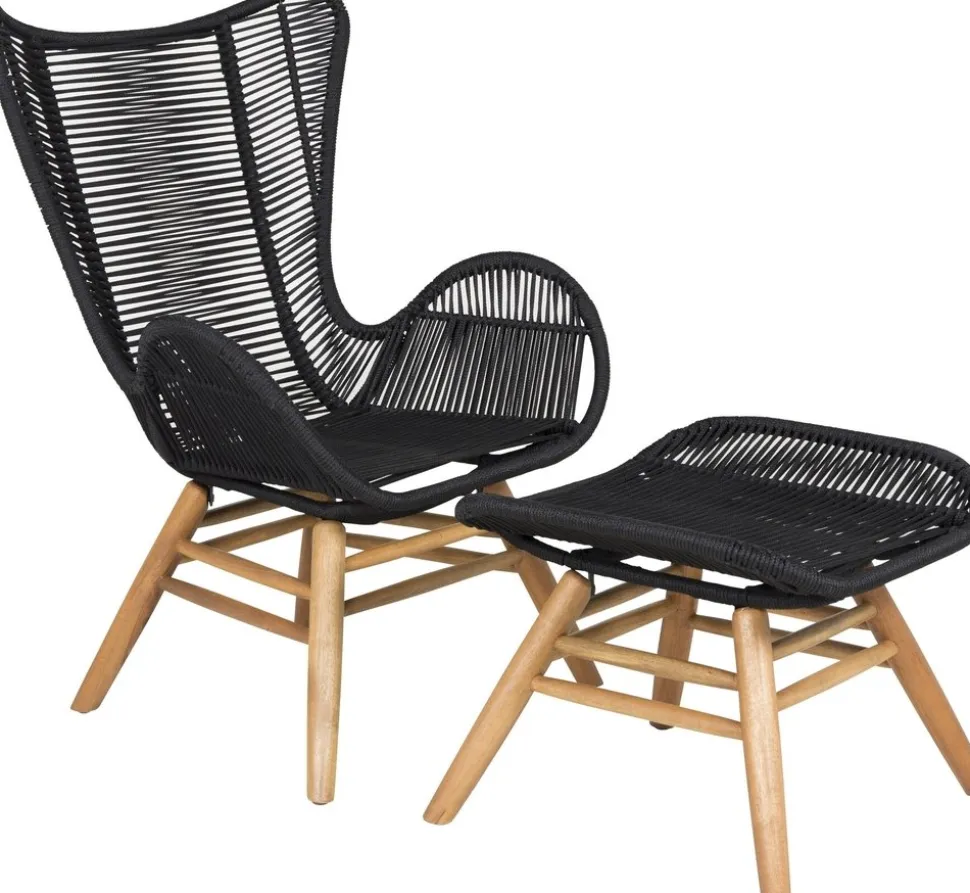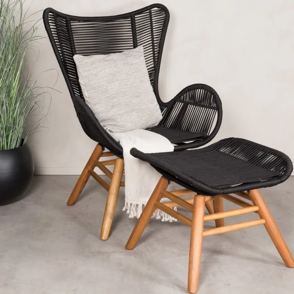 Lika snygg i sin design som bekväm att sitta i. Tjingeling är en loungestol med tillhörande fotpall som garanterat blir ett modernt blickfång på uteplatsen. Benen är tillverkade i acacia och sitsen i slitstarkt vävt rep. Gör dig redo för sommarens uteliv! Skötselråd: Våra rep är kvalitetsspunna polyesterrep som är lätta att rengöra. Möblerna är behandlade för att klara 500-2000 timmar. Vi rekommenderar såpa och vatten för rengöring. Låt lufttorka. För de områdena som är svårare att komma åt kan en liten borste användas försiktigt. Använd aldrig högtryckstvätt eller starka kemikalier för att rengöra repet.