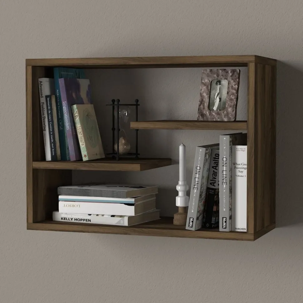 Vägghylla av melaminbelagd spånskiva.