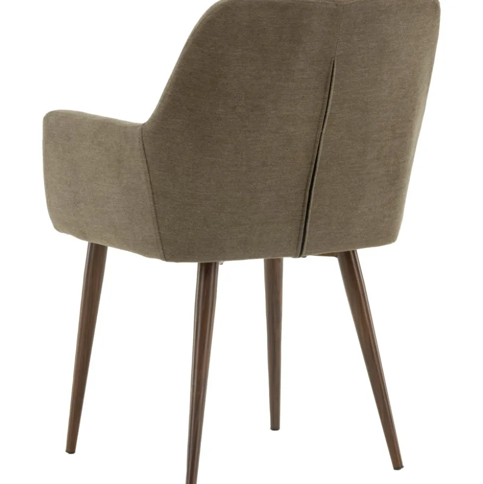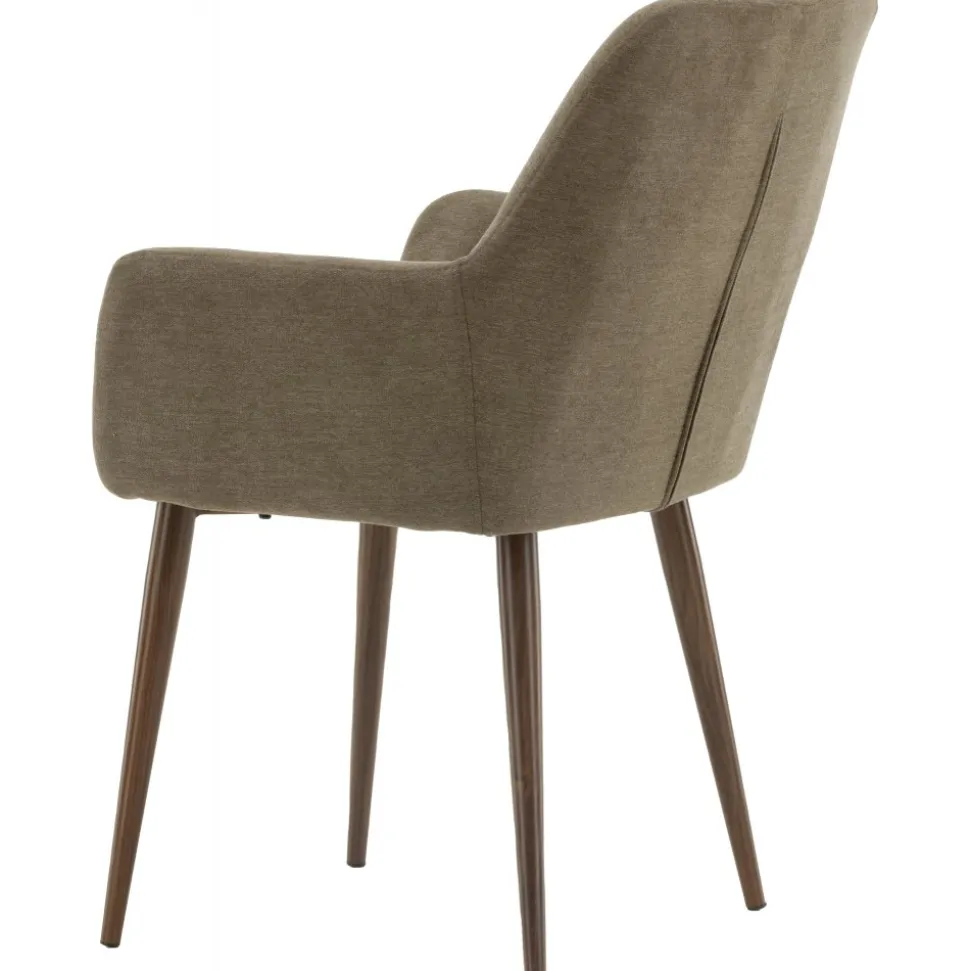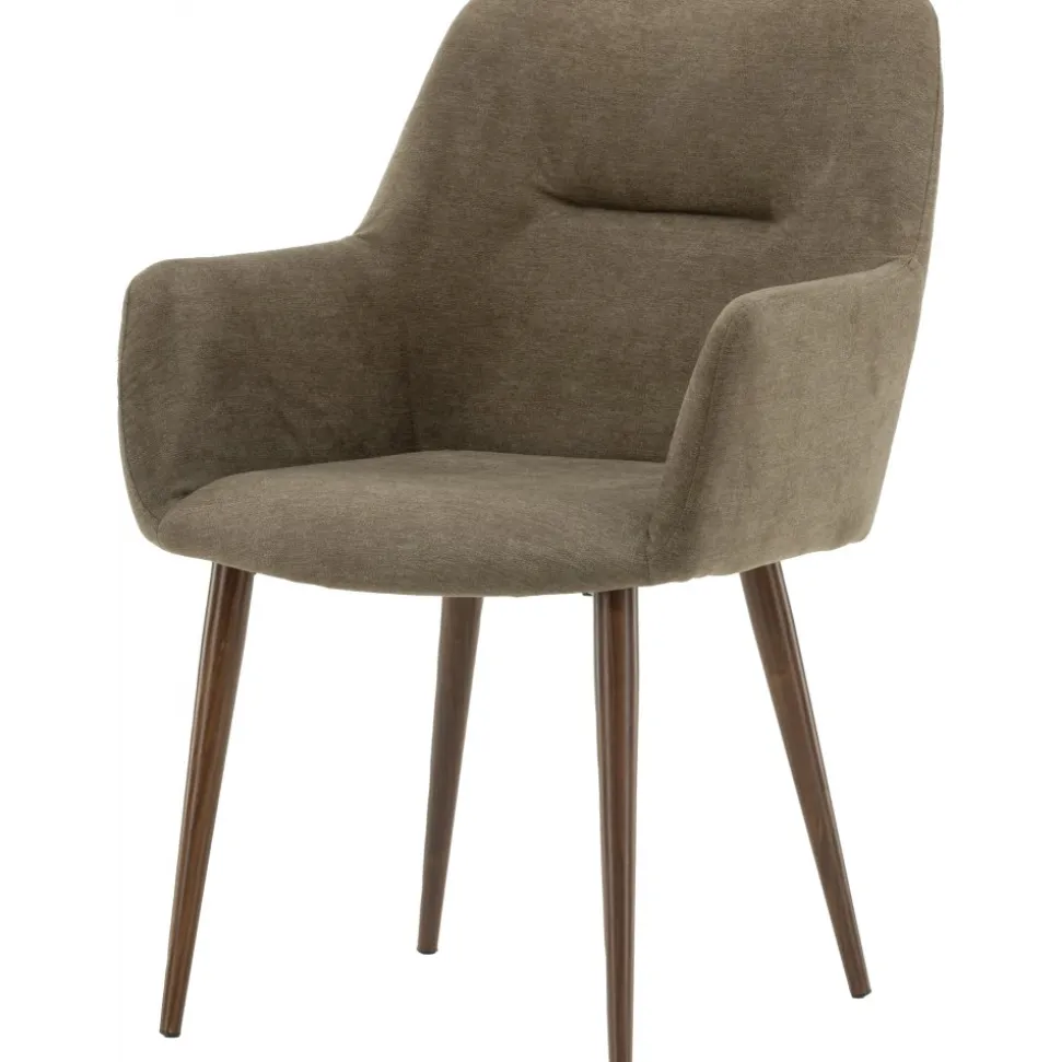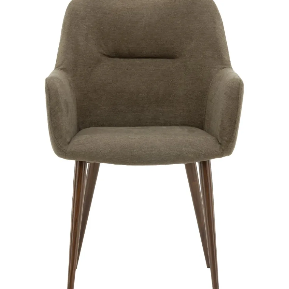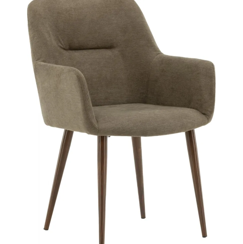 Bekväm matstol med helklädd sits och integrerade armstöd i brunt polyestertyg. Stolen har lätt utsvängda stolsben i en modern valnötsbrun kulör. Skapa en inbjudande och charmig atmosfär som känns hemtrevlig och familjär!